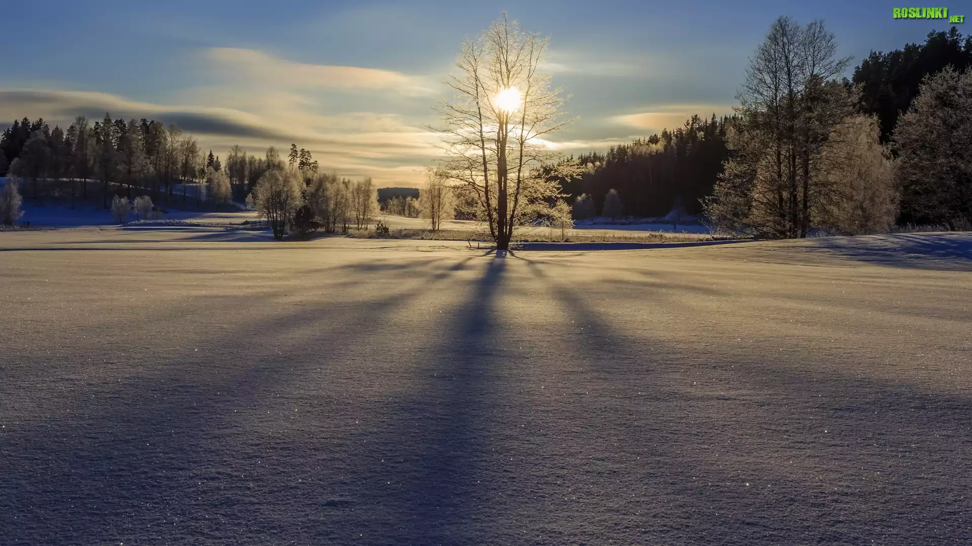 Rośliny: Zima, Drzewa, Las, Wschód słońca, Chmury