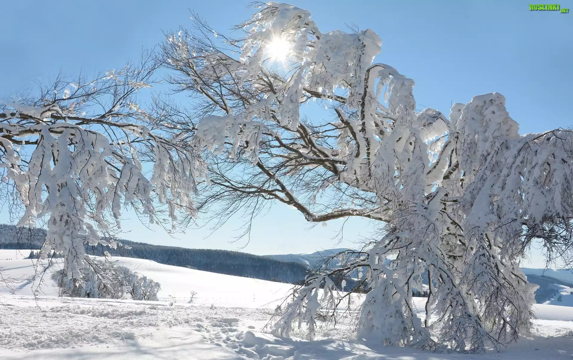 Rośliny: Zima, Drzewa, Promienie słońca, Śnieg