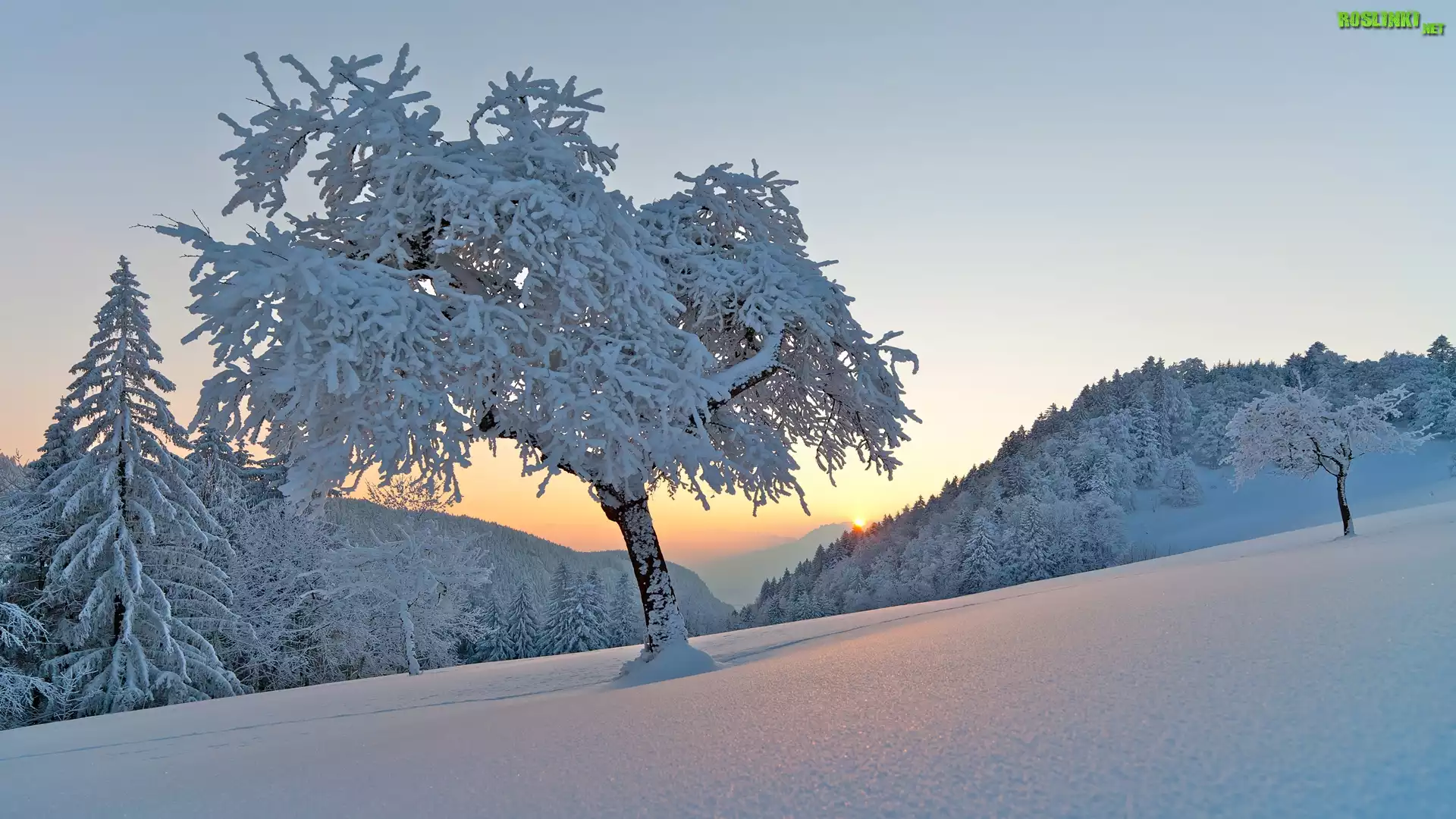 Rośliny: Zima, Drzewa, Wschód słońca, Wzgórza