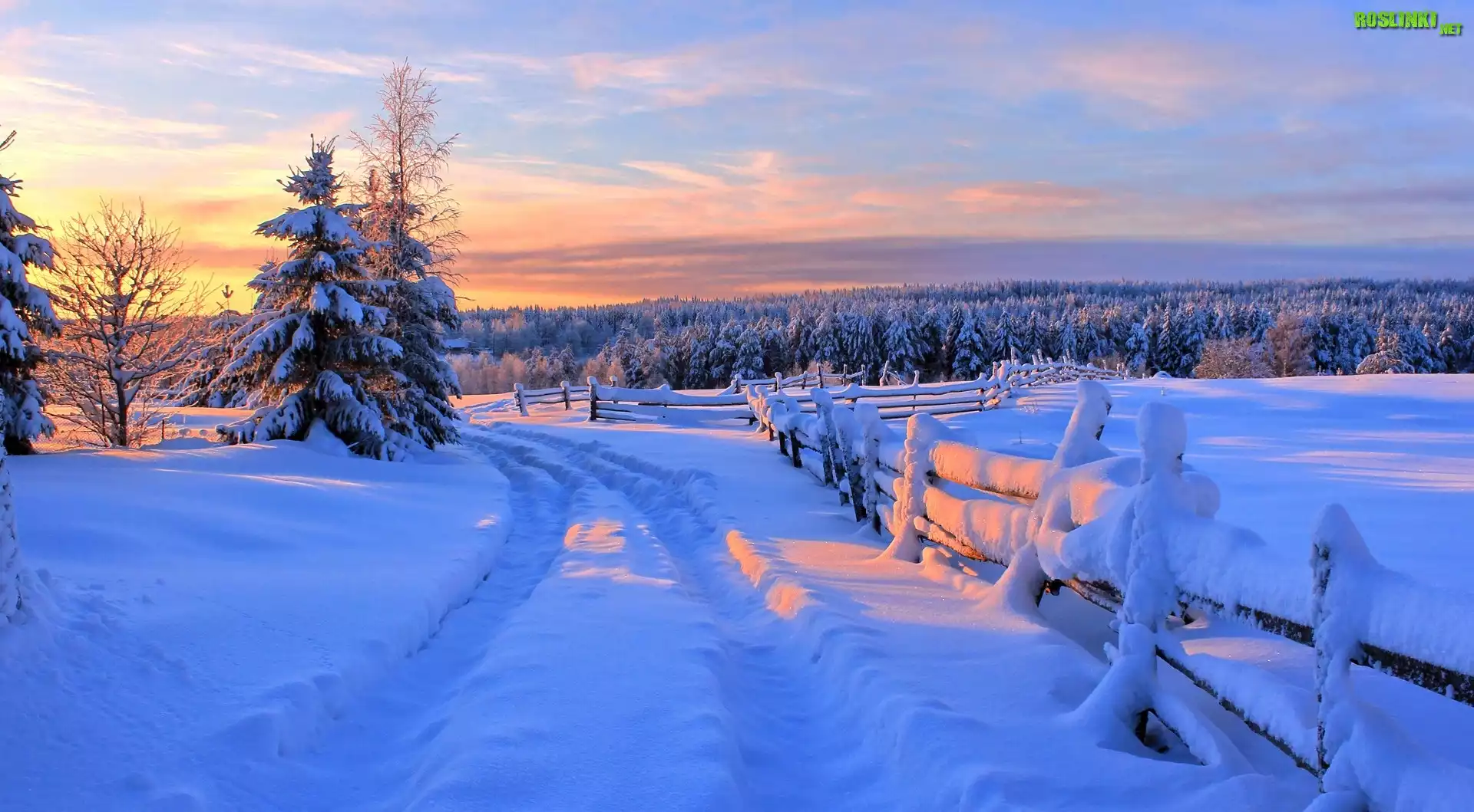 Rośliny: Zima, Ogrodzenie, Wschód słońca, Świerki