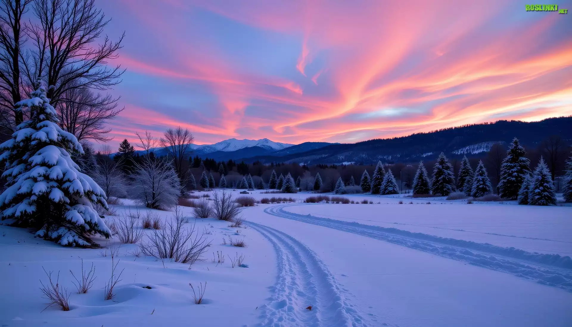 Rośliny: Zima, Drzewa, Ośnieżona, Łąka, Góry, Zachód słońca, Grafika AI