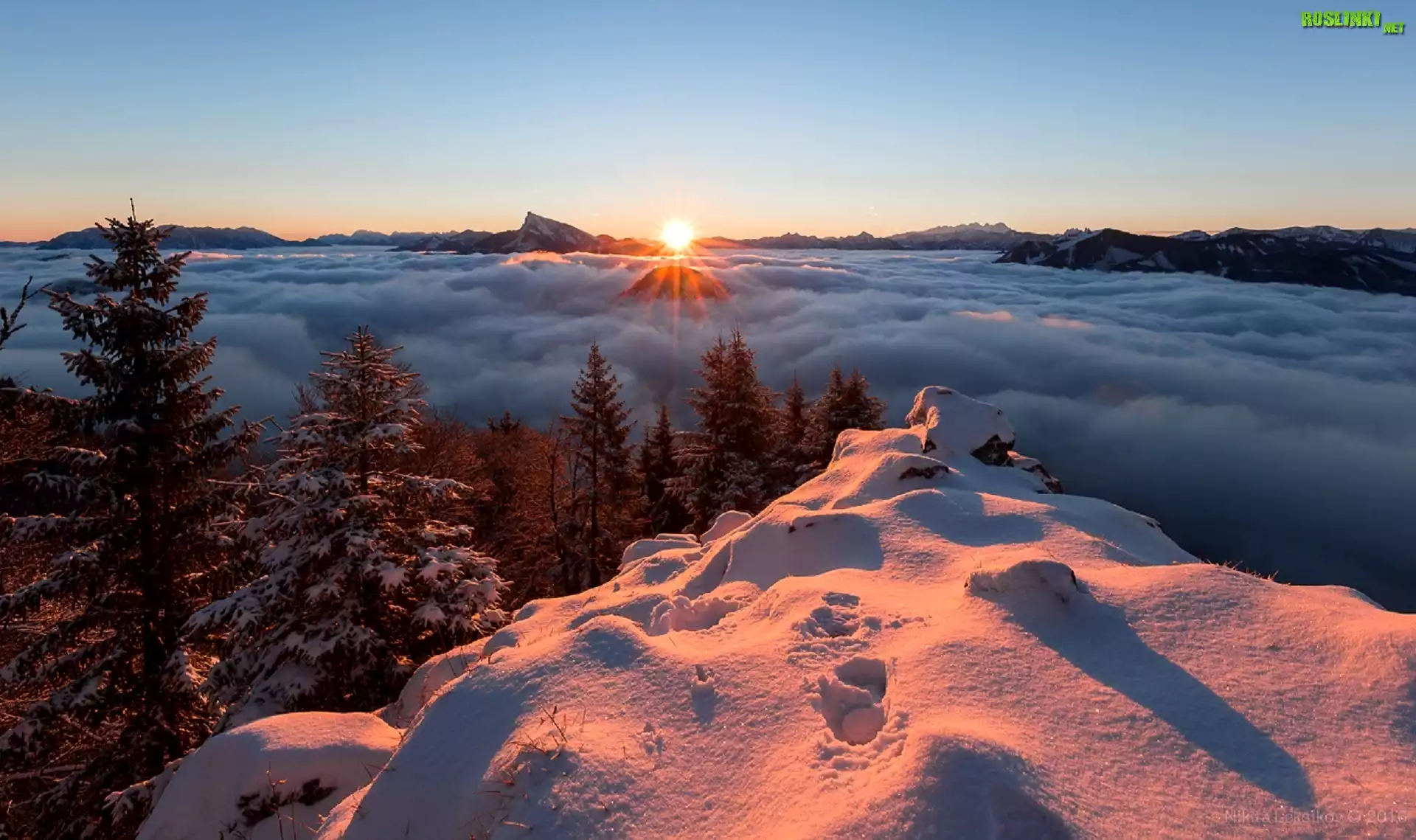 Rośliny: Zima, Drzewa, Zachód słońca, Mgła