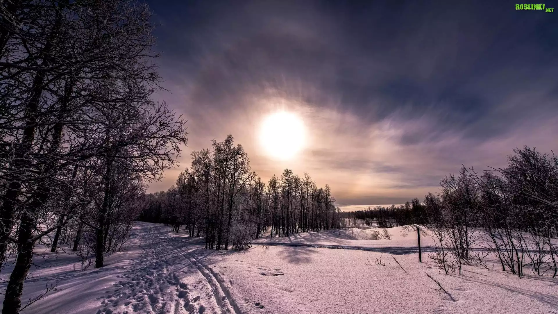 Rośliny: Zima, Drzewa, Zachód słońca, Śnieg