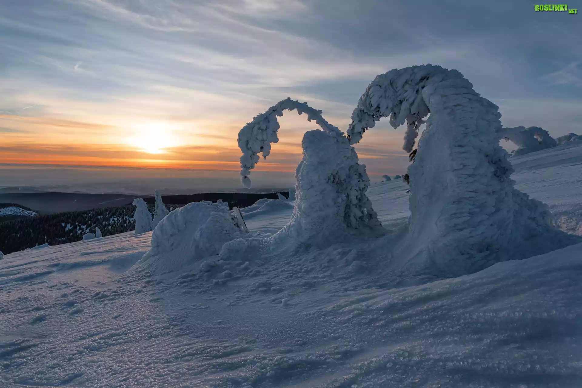 Rośliny: Zima, Drzewa, Zachód słońca, Wzgórze