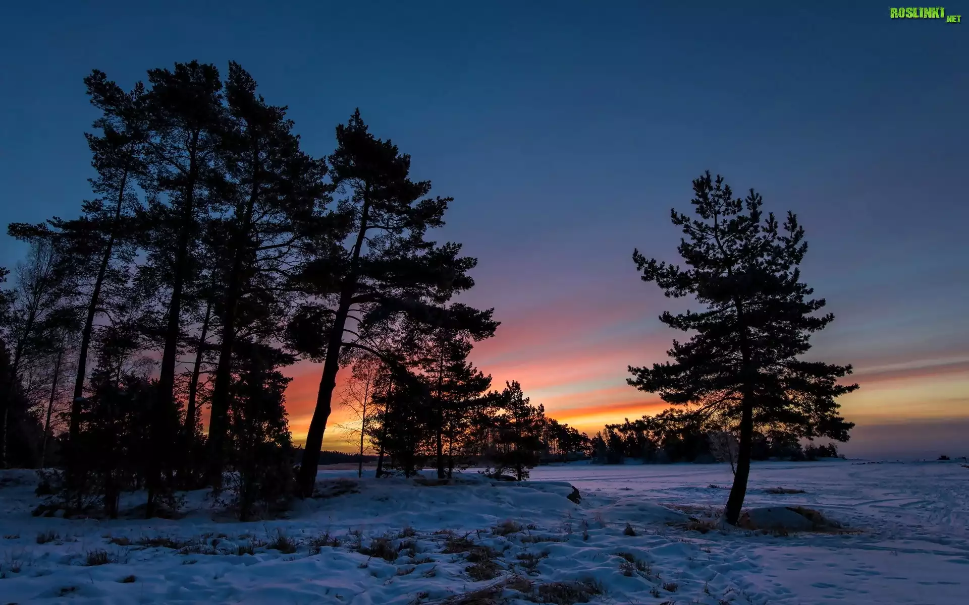 Rośliny: Zima, Zachód, Słońca, Drzewa