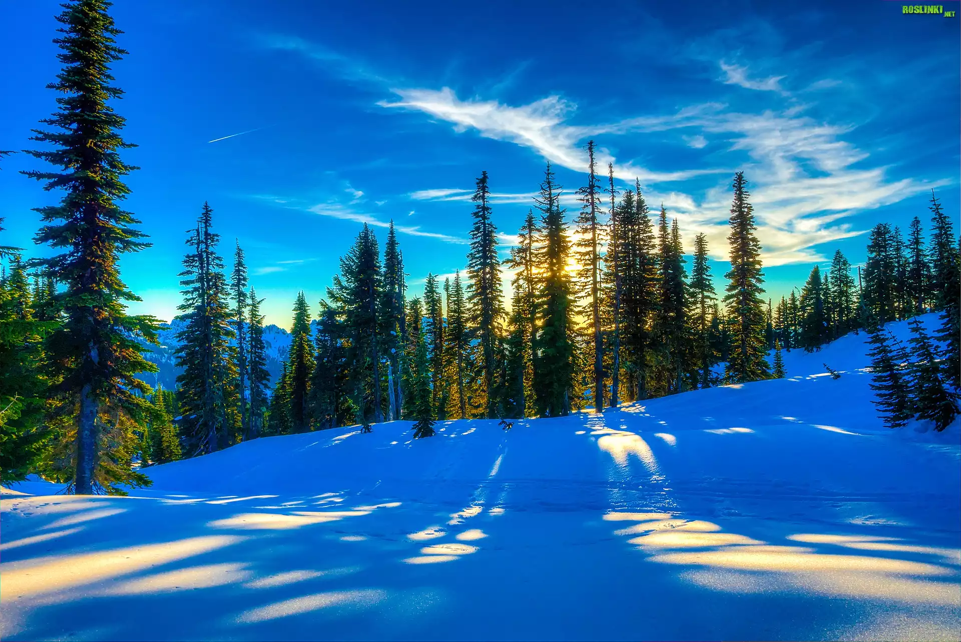 Rośliny: Zima, Śnieg, Zachód, Słońca, Drzewa