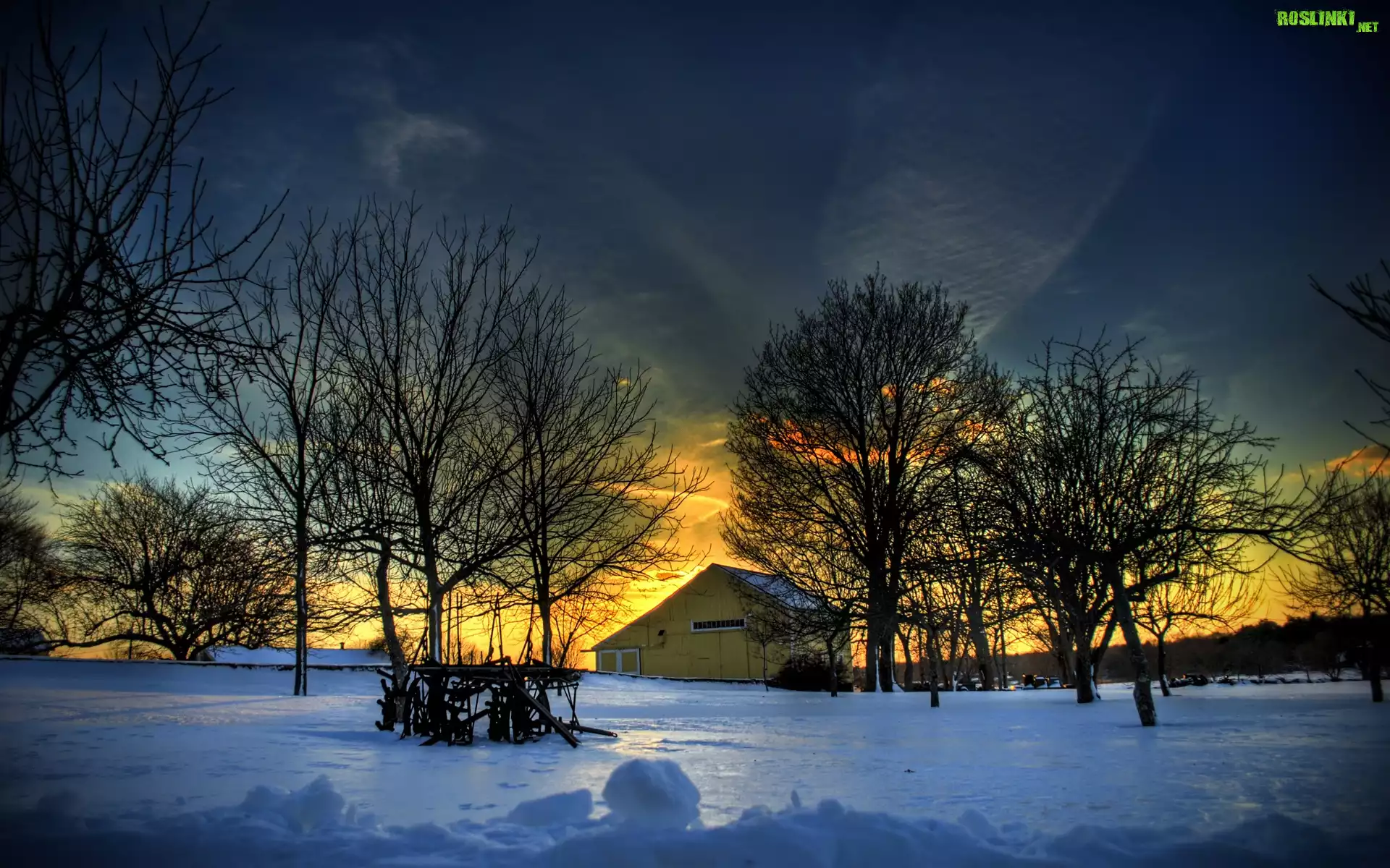 Rośliny: Zima, Śnieg, Zachód, Słońca, Drzewa