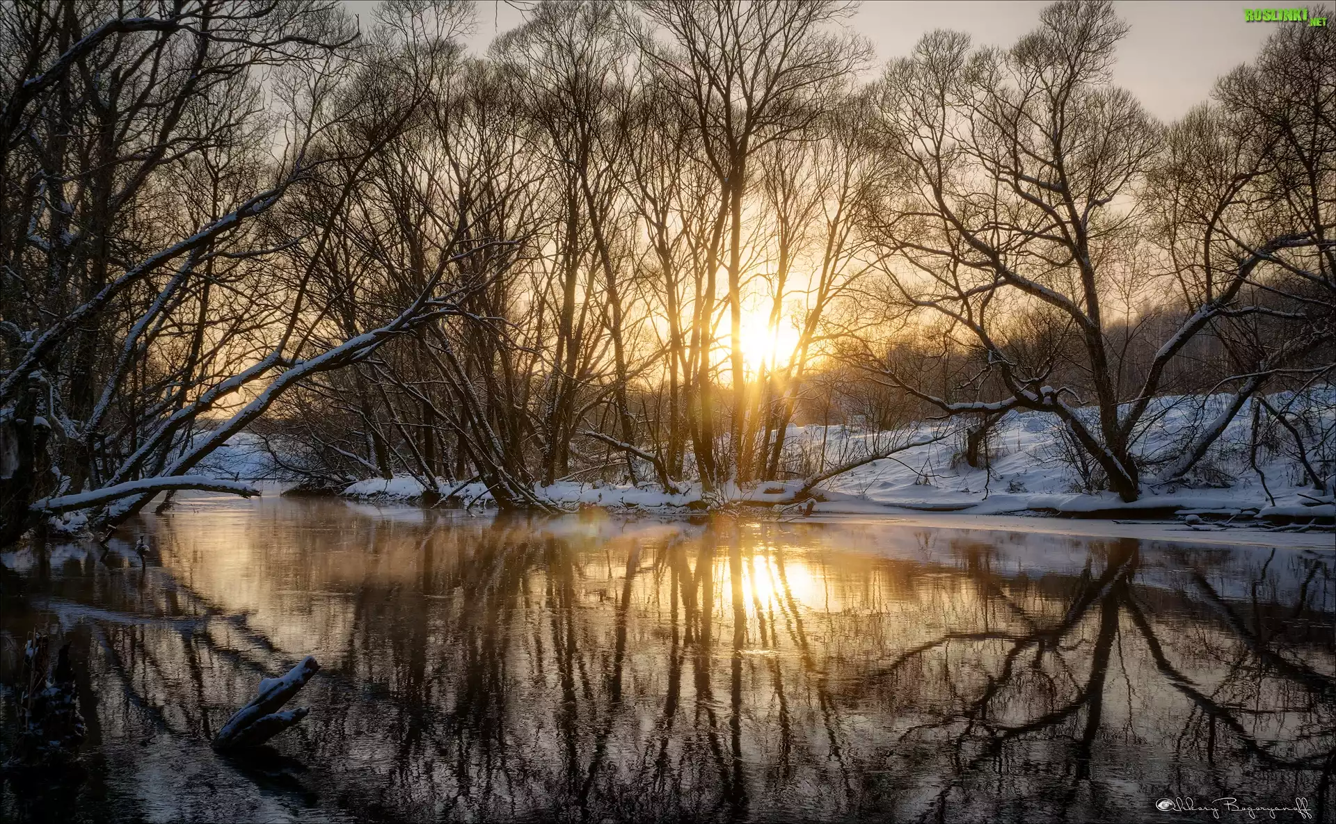 Rośliny: Zima, Rzeka, Drzewa, Słońce, Odbicie