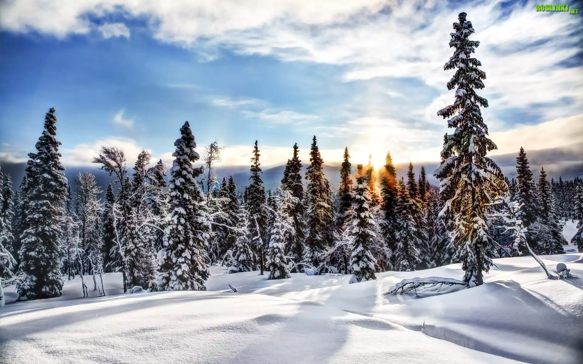 Rośliny: Zima, Śnieg, Las, Słońce, Świerki