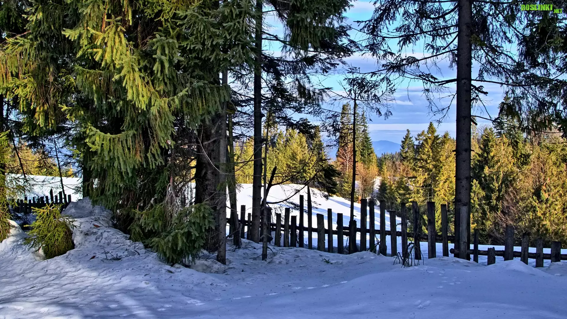 Rośliny: Zima, Śnieg, Płot, Drzewa, Słoneczny, Dzień