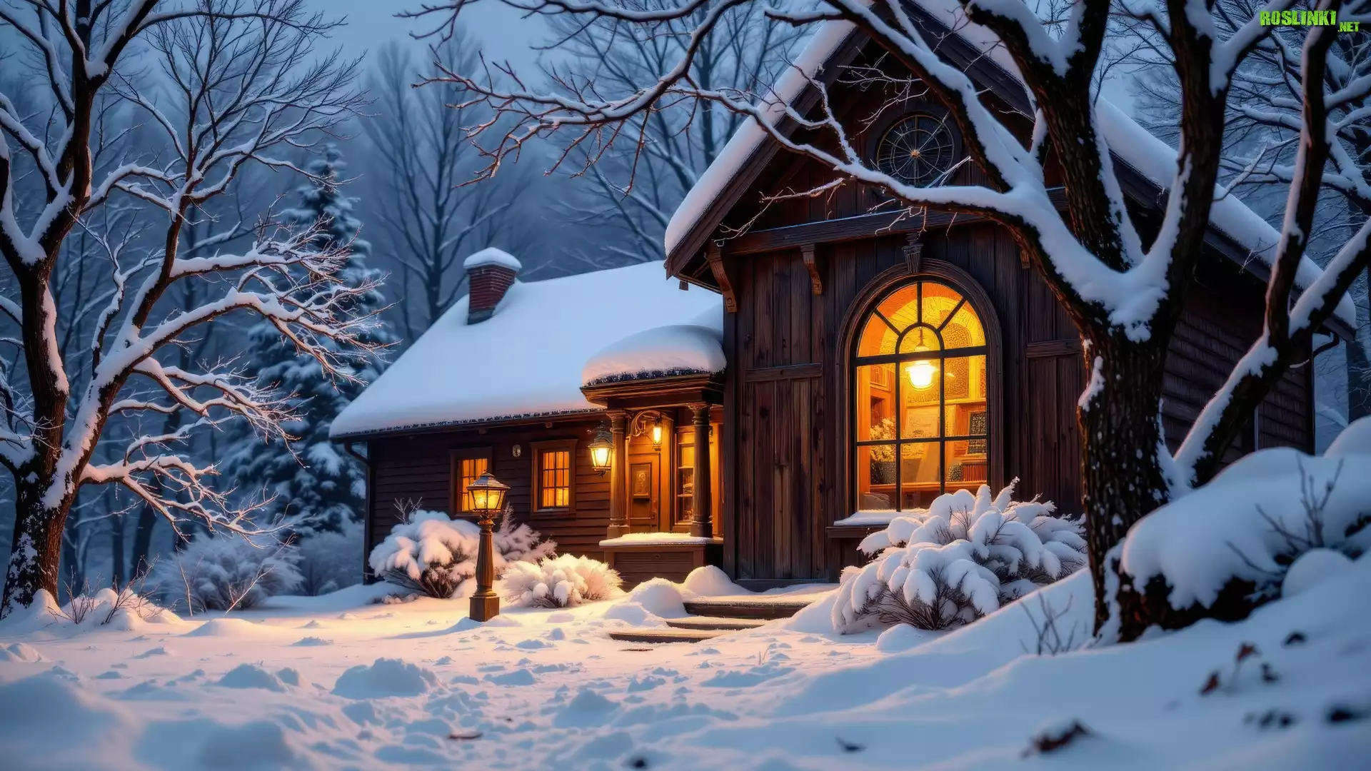 Rośliny: Zima, Las, Drzewa, Krzewy, Noc, Dom, Światła, Latarnie, Śnieg, AI