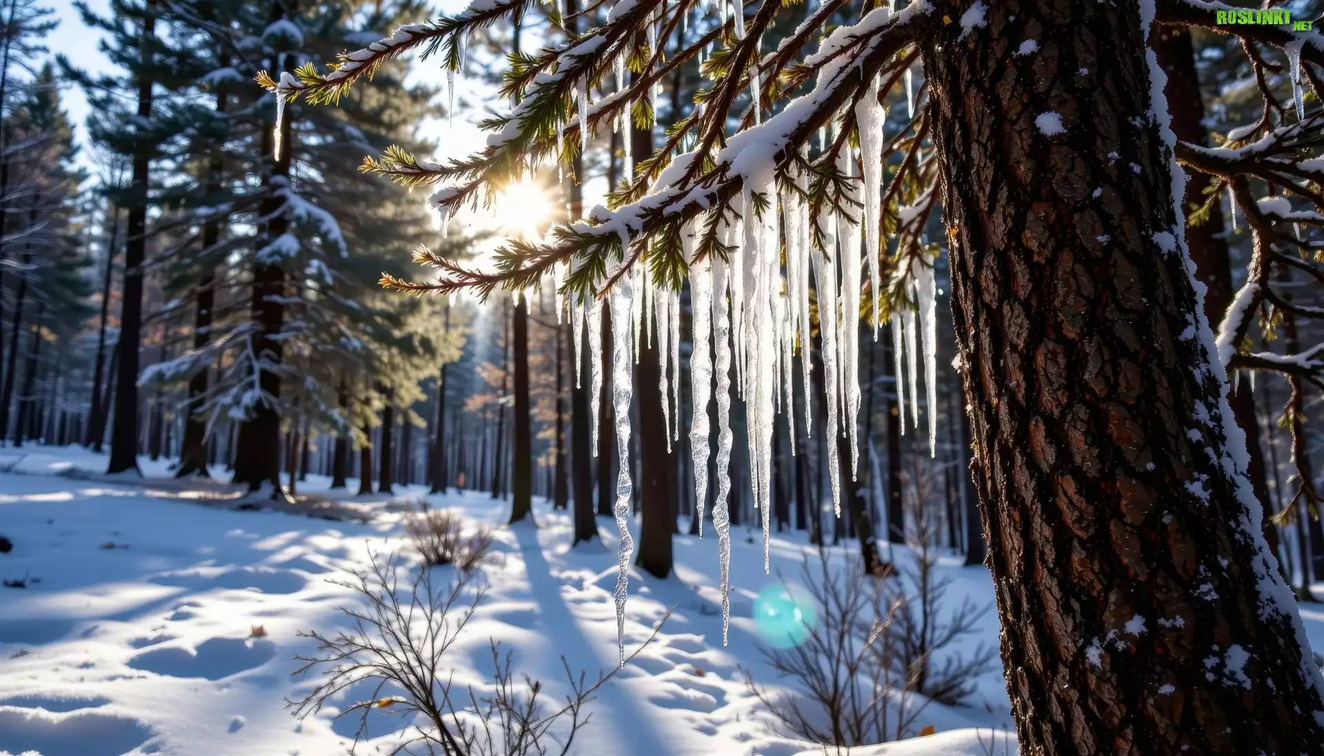 Rośliny: Drzewo, Gałęzie, Sople, Zima, Las, Grafika AI