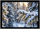 Rośliny: Zima, Drzewa, Las, Ośnieżone, Gałązki, Słoneczne, Światło, Grafika AI
