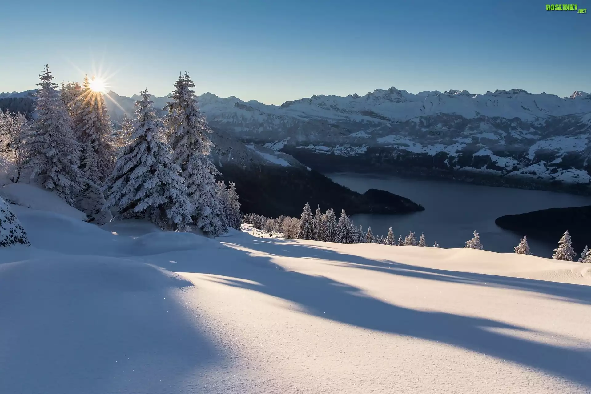 Rośliny: Szwajcaria, Zima, Góry, Alpy, Promienie słońca, Świerki