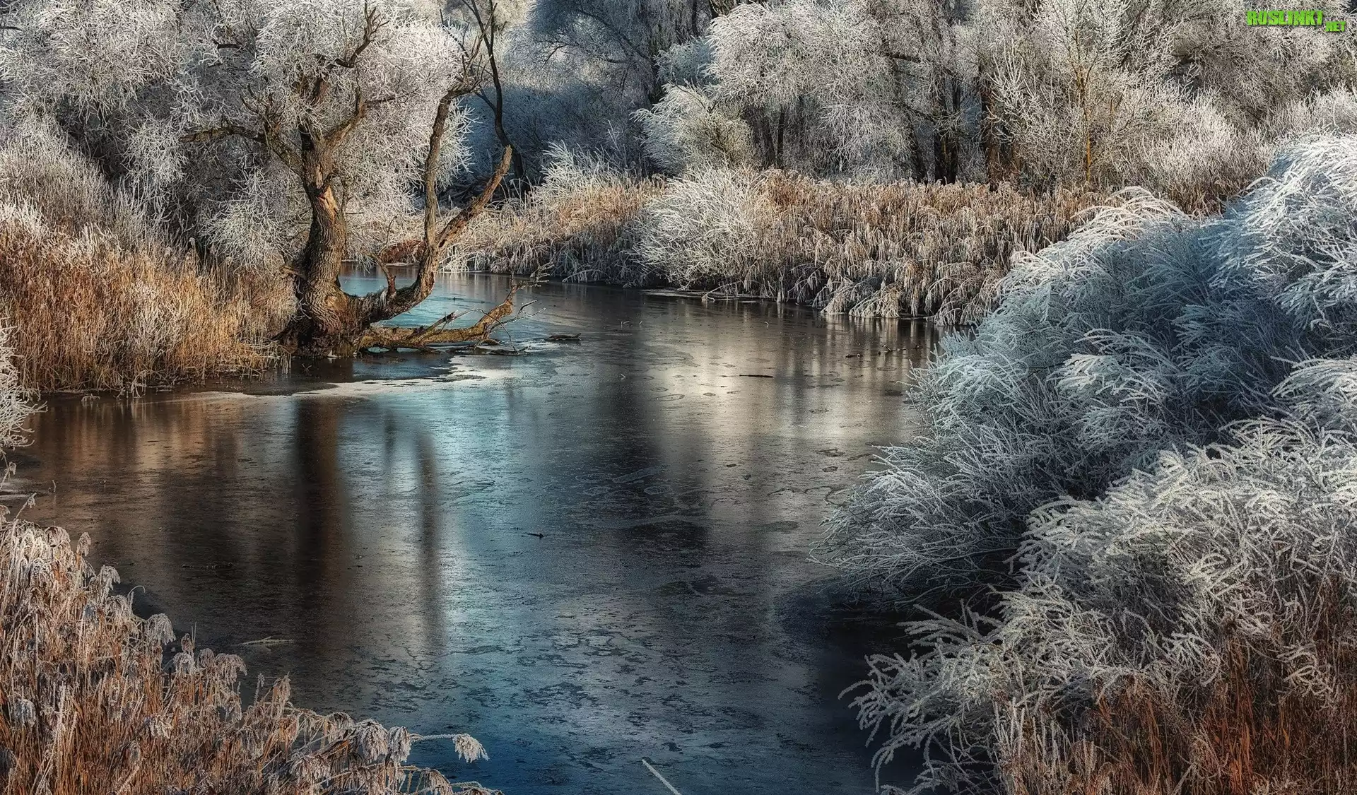 Rośliny: Zima, Rzeka, Drzewa, Trawy, Szron