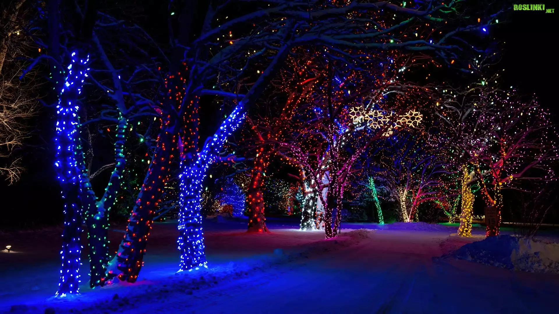 Rośliny: Zima, Droga, Noc, Drzewa, Światełka, Kolorowe