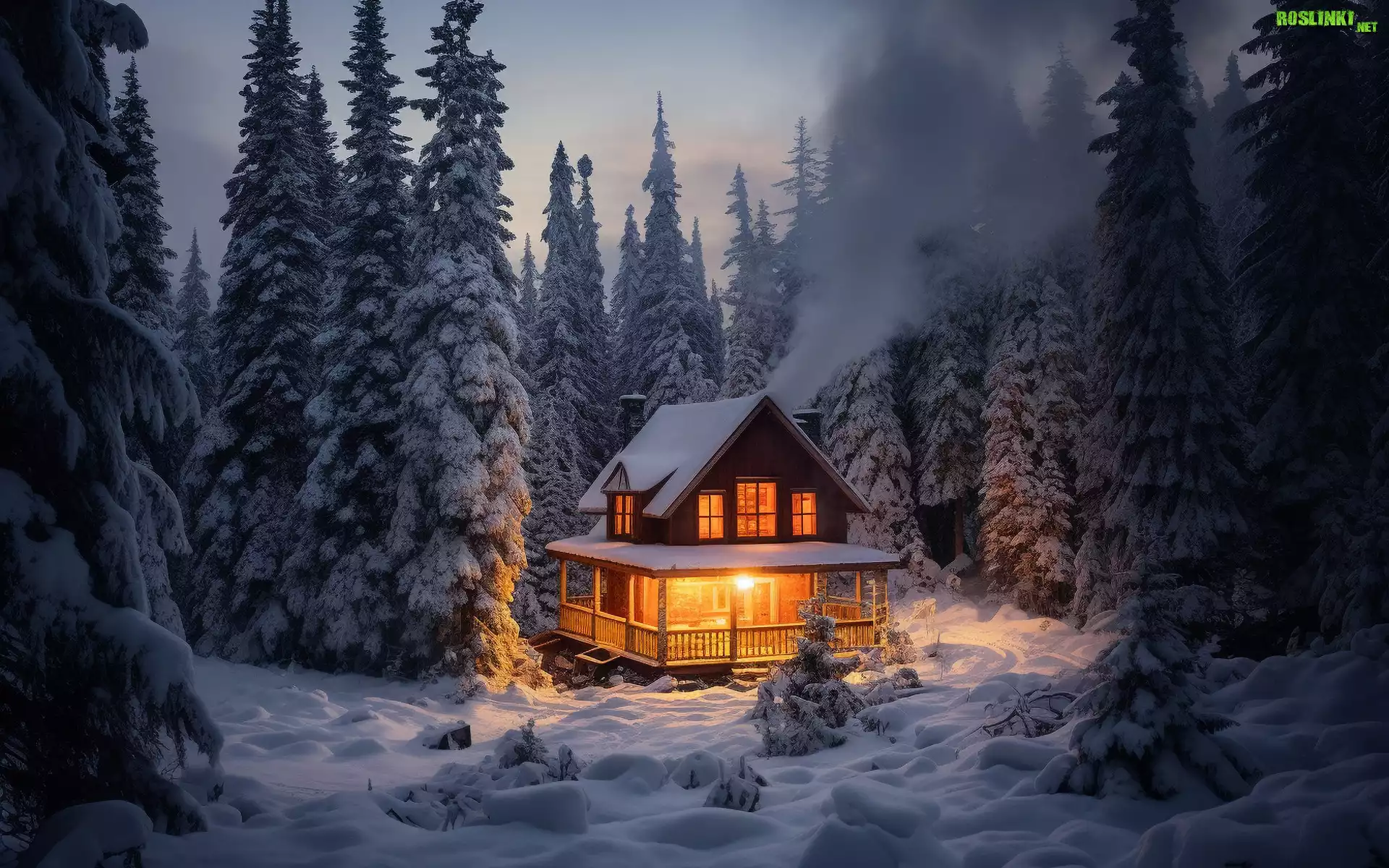 Rośliny: Zima, Las, Drzewa, Dom, Dym, Śnieg, Mróz, Światła, Wieczór, Chmury