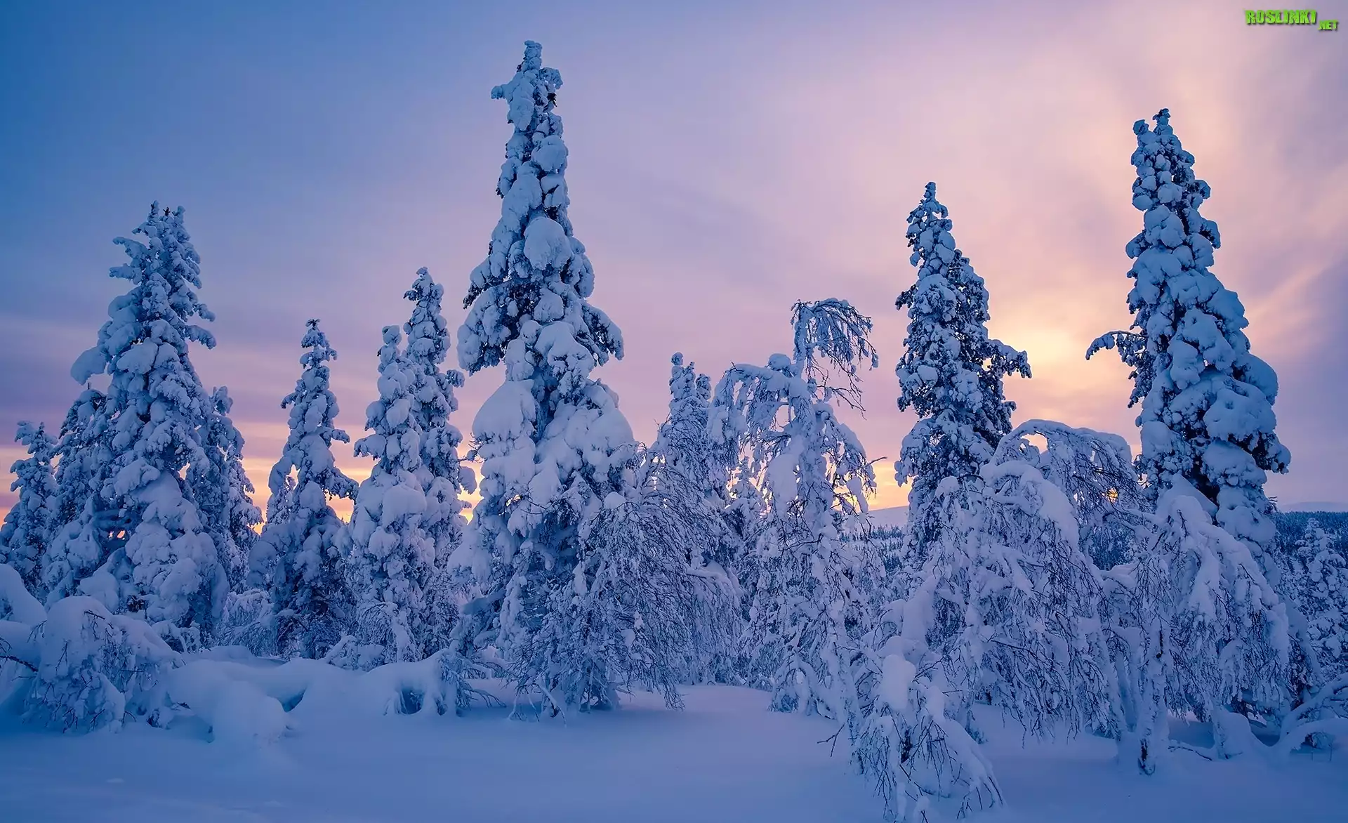 Rośliny: Zima, Wschód słońca, Ośnieżone, Świerki, Drzewa