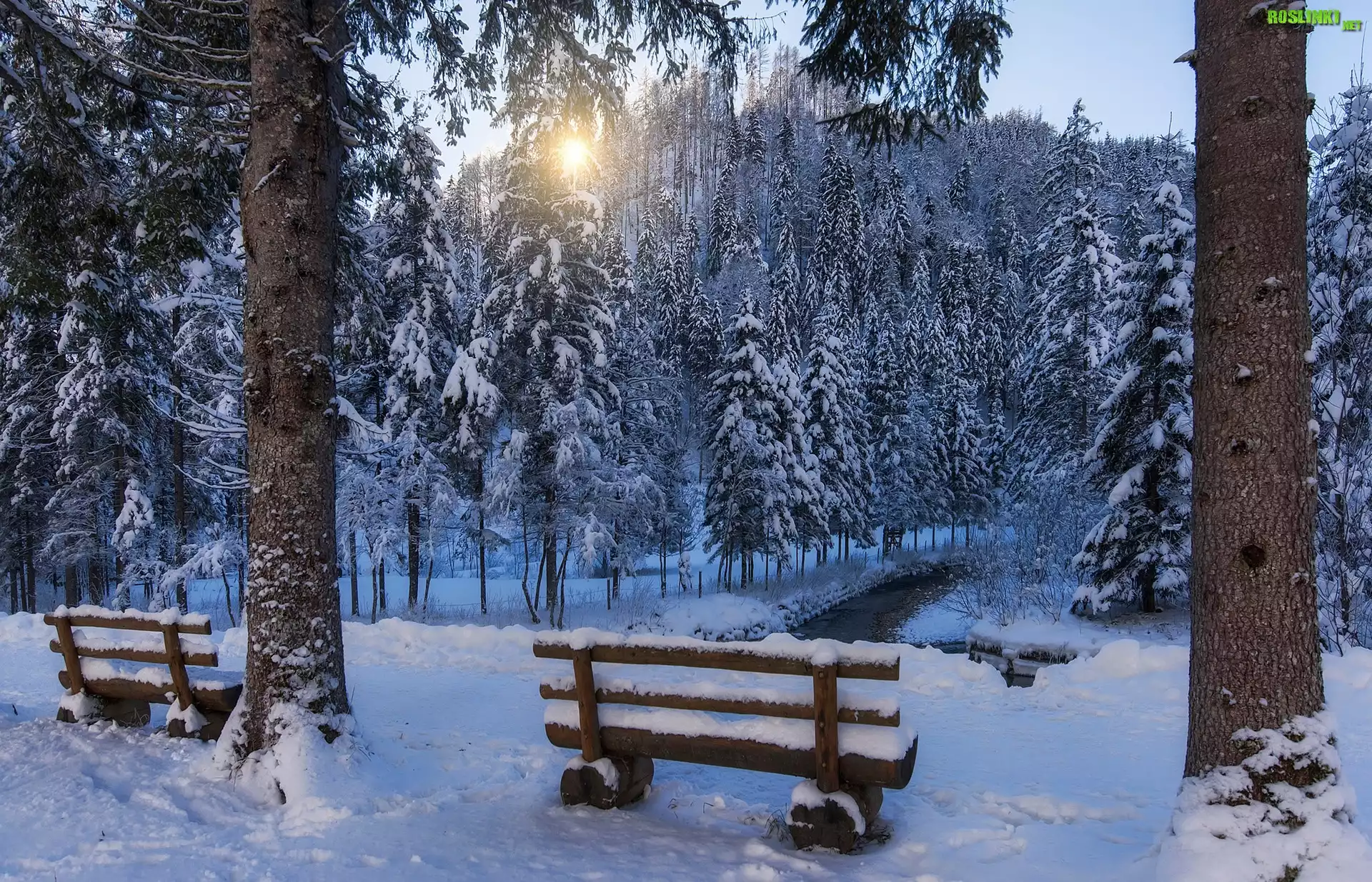 Rośliny: Zima, Park, Drzewa, Ławki, Wschód słońca