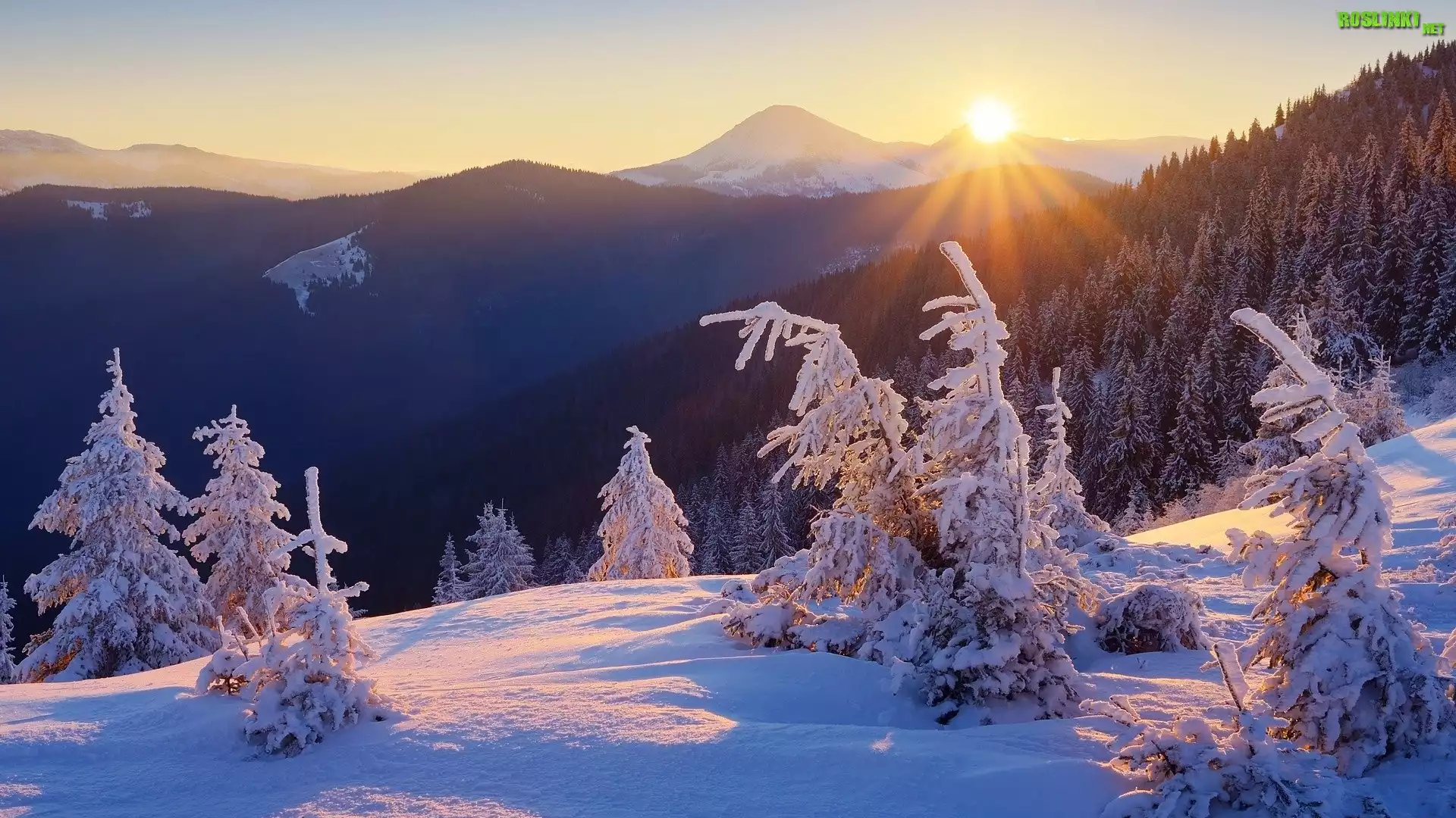 Rośliny: Zima, Góry, Drzewa, Las, Wschód słońca