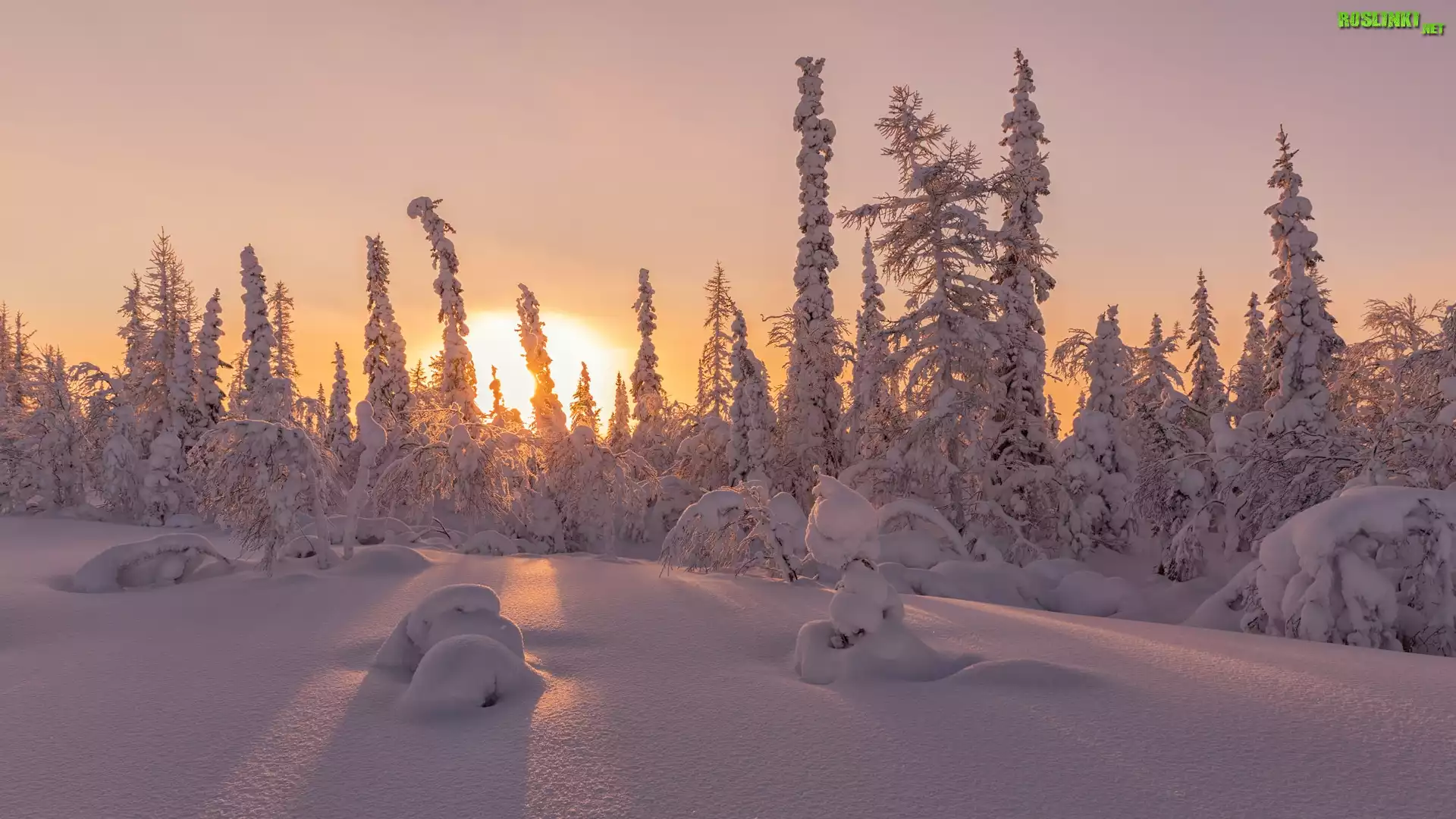 Rośliny: Zima, Ośnieżone, Drzewa, Rośliny, Wschód słońca