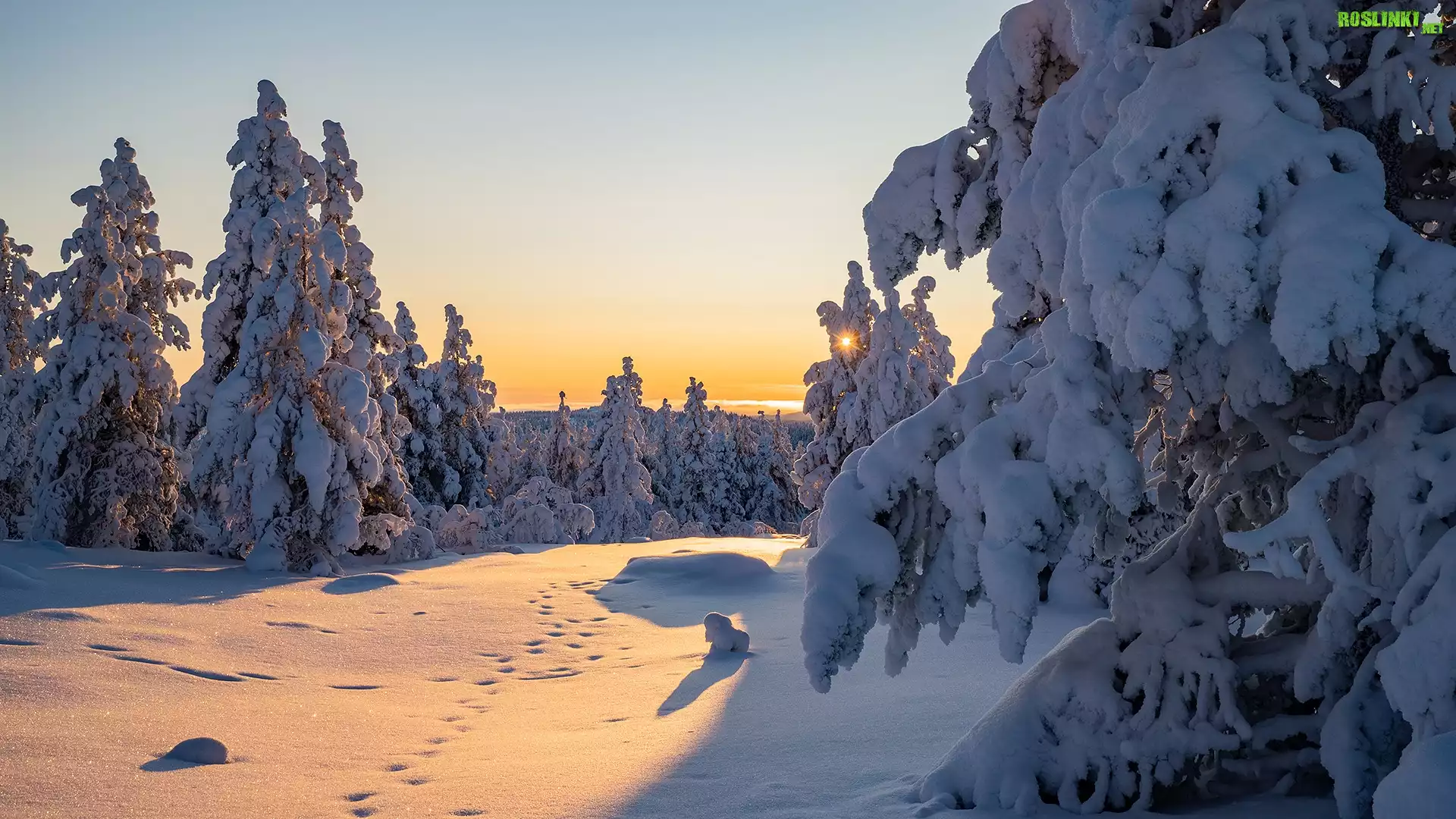 Rośliny: Zima, Ośnieżone, Drzewa, Świerki, Wschód słońca