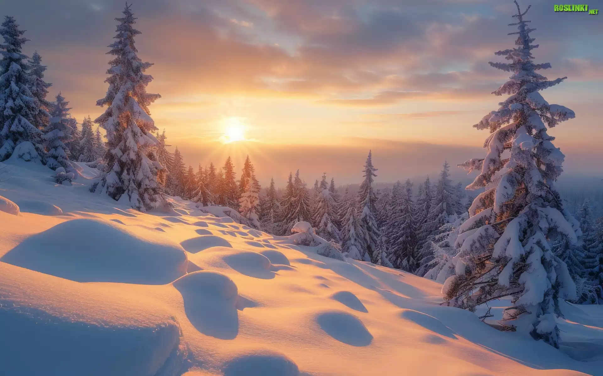 Rośliny: Zima, Las, Drzewo, Śnieg, Zaspa, Wzgórze, Niebo, Poranek, Wschód słońca