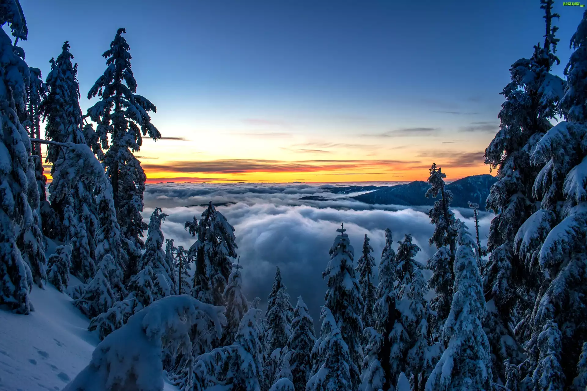 Rośliny: Zima, Ośnieżone, Świerki, Wschód słońca