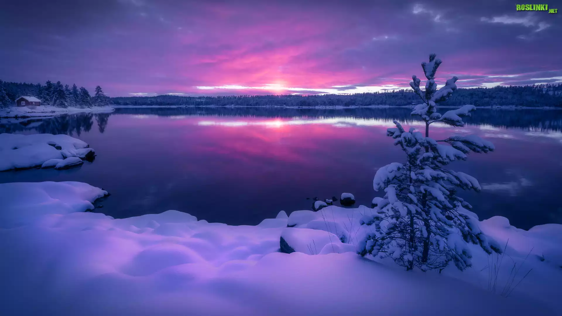 Rośliny: Zima, Jezioro, Drzewa, Dom, Zachód słońca