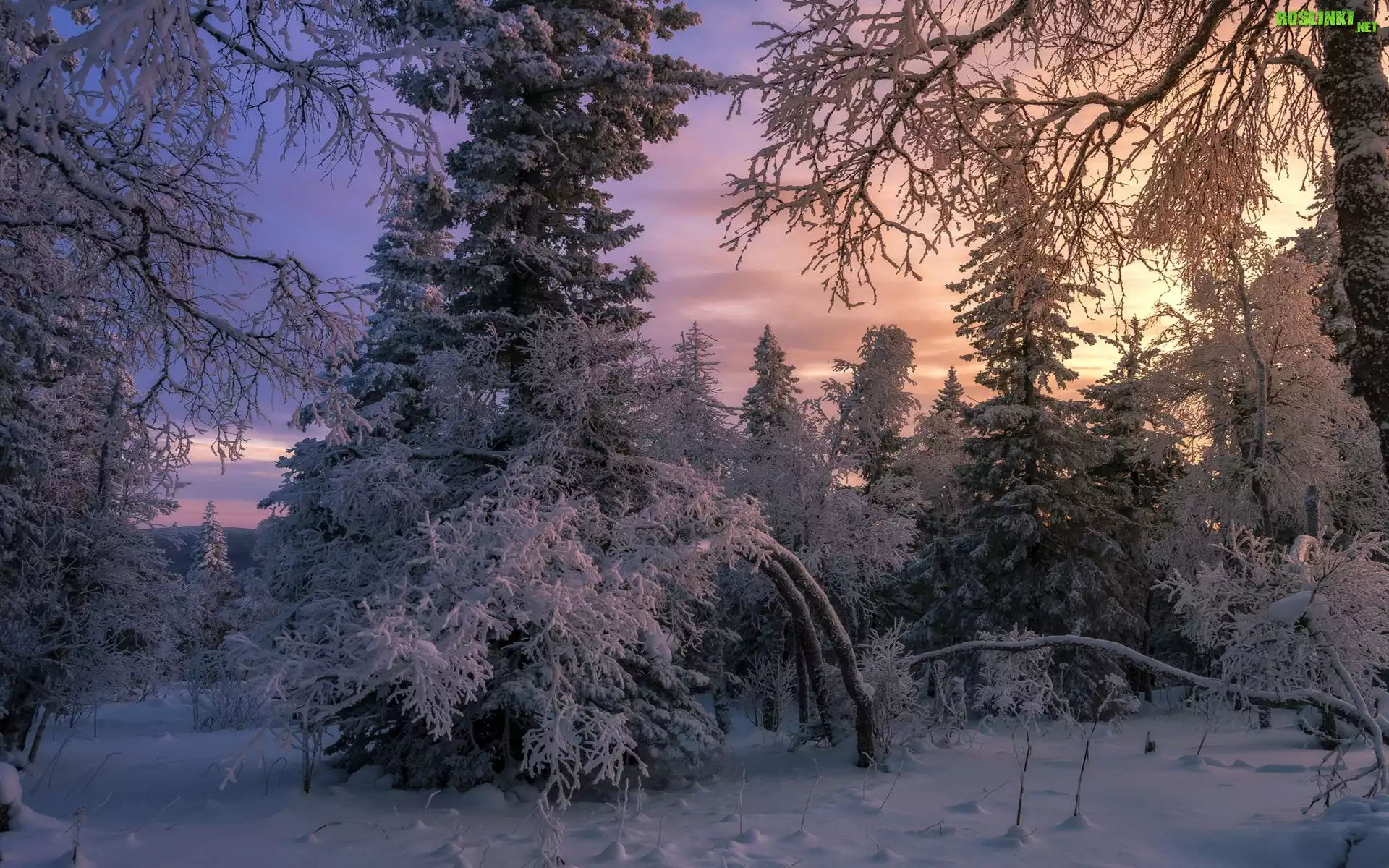 Rośliny: Zima, Ośnieżone, Drzewa, Gałęzie, Zachód słońca