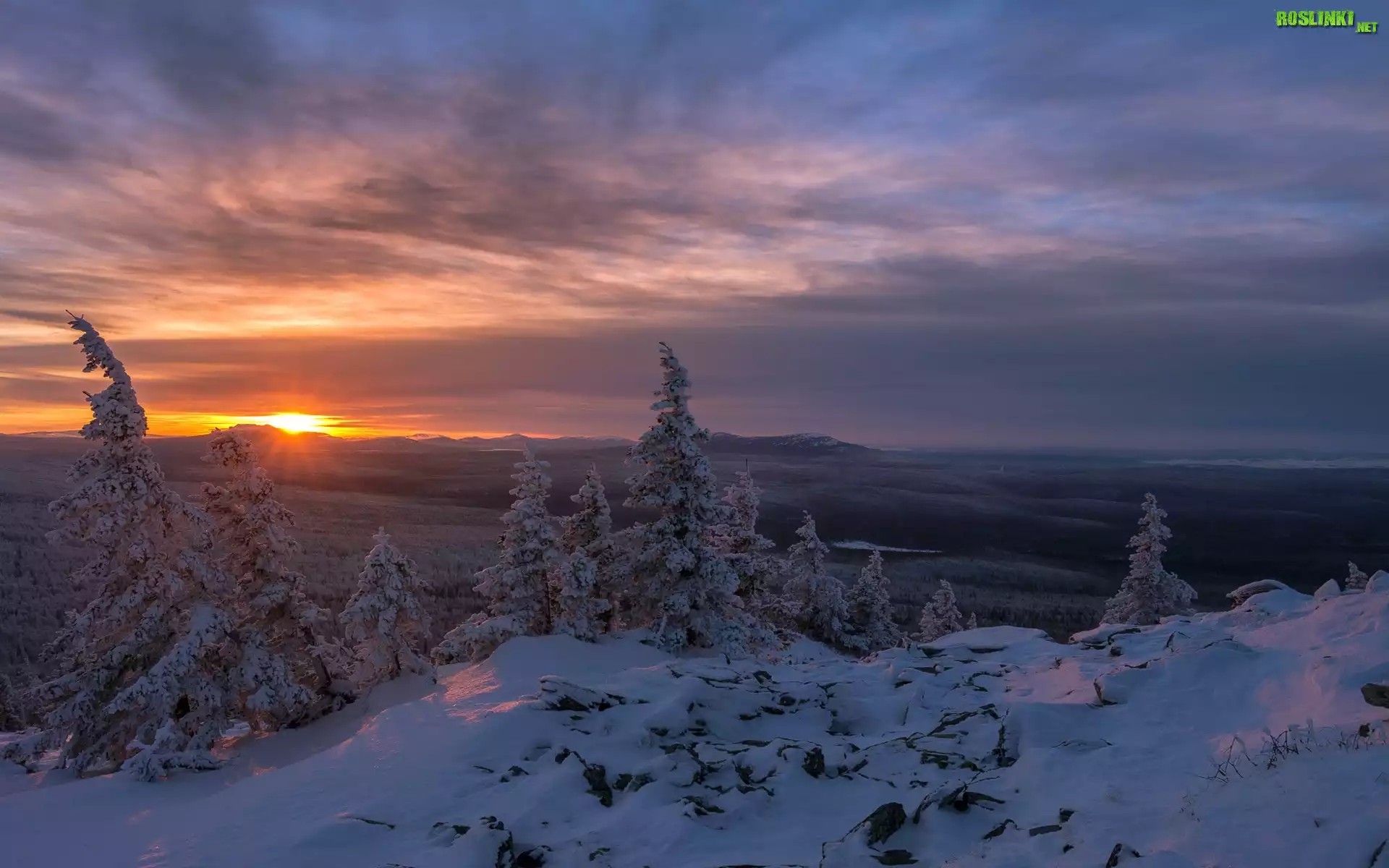 Rośliny: Zima, Góry, Drzewa, Zachód słońca