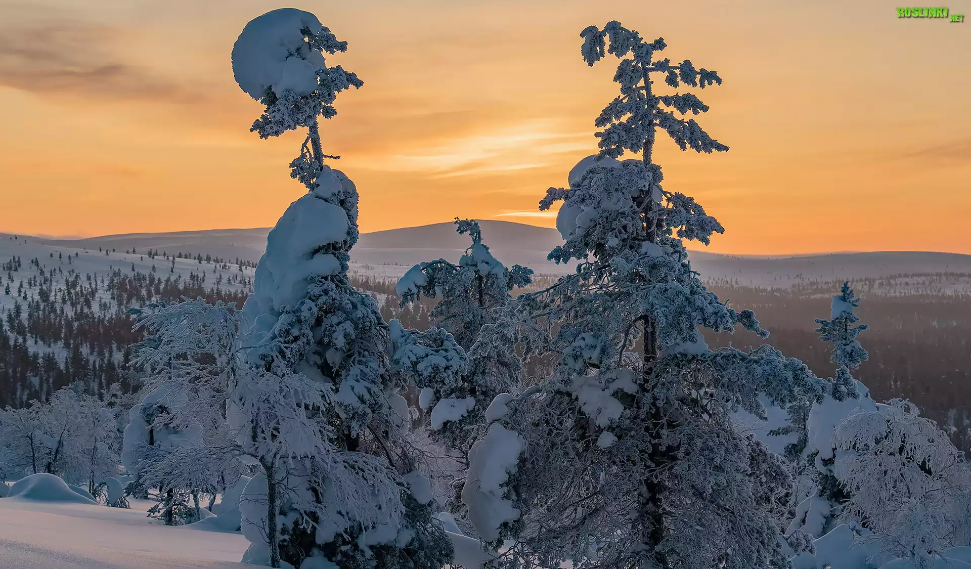 Rośliny: Zima, Zaśnieżone, Drzewa, Góry, Zachód słońca