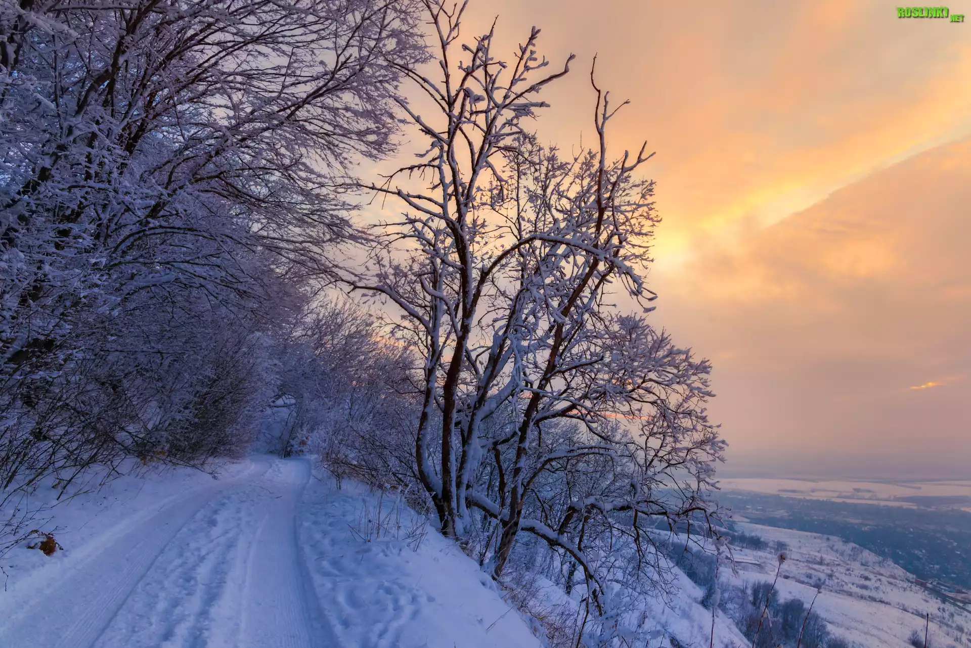 Rośliny: Zima, Droga, Drzewa, Las, Zachód słońca