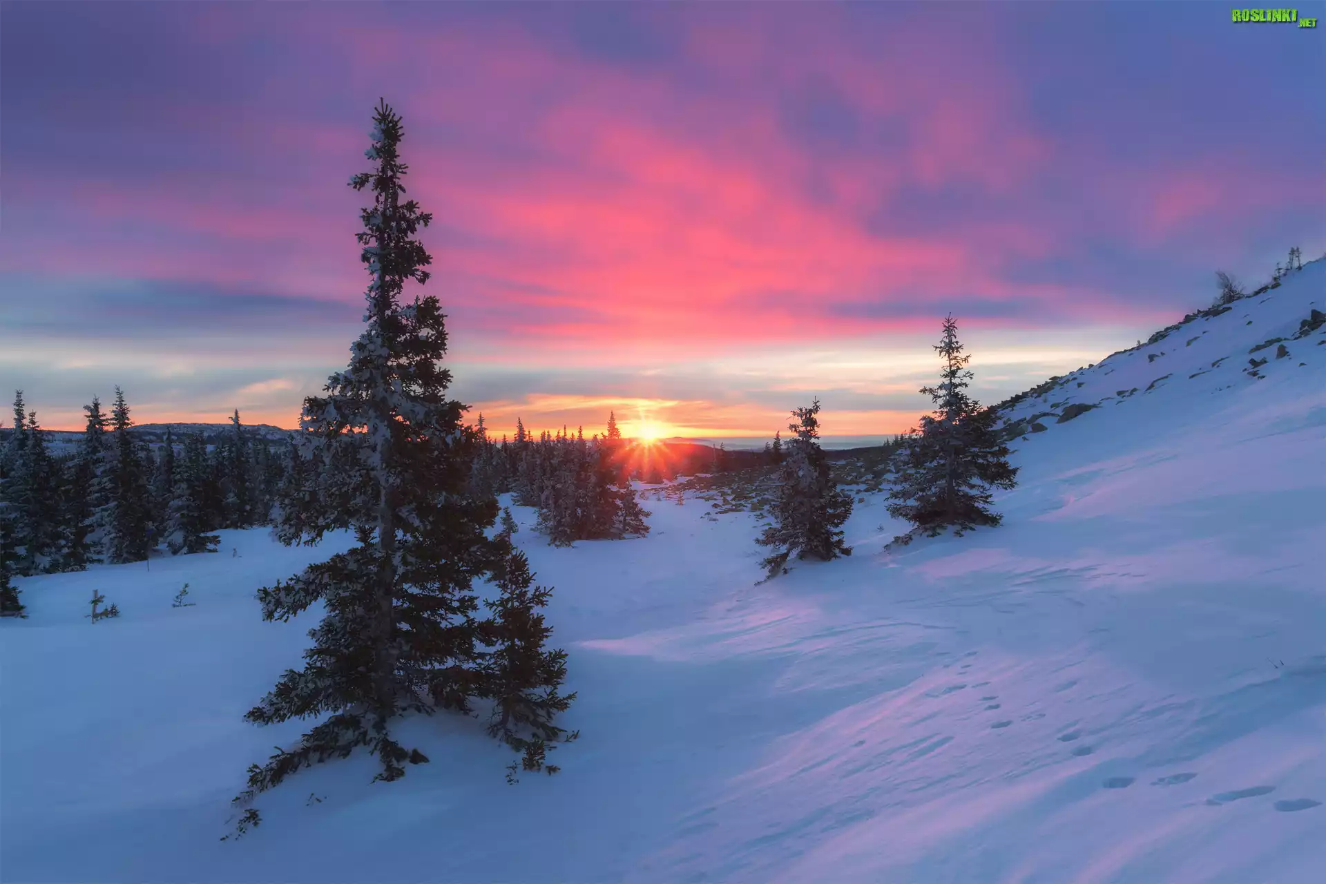 Rośliny: Zima, Wzgórza, Drzewa, Promienie, Zachód słońca