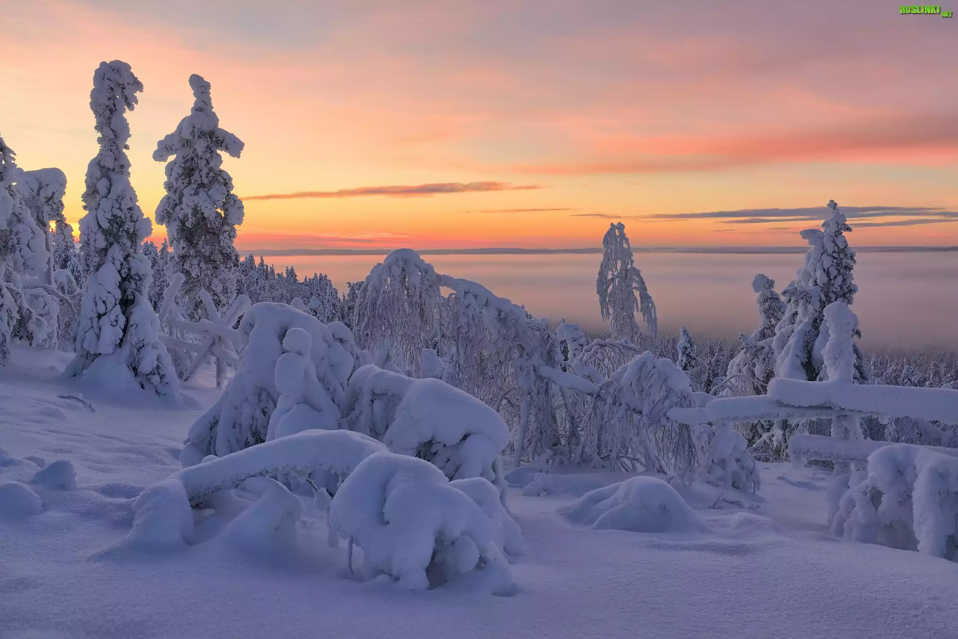 Rośliny: Zima, Zaśnieżone, Drzewa, Zachód słońca