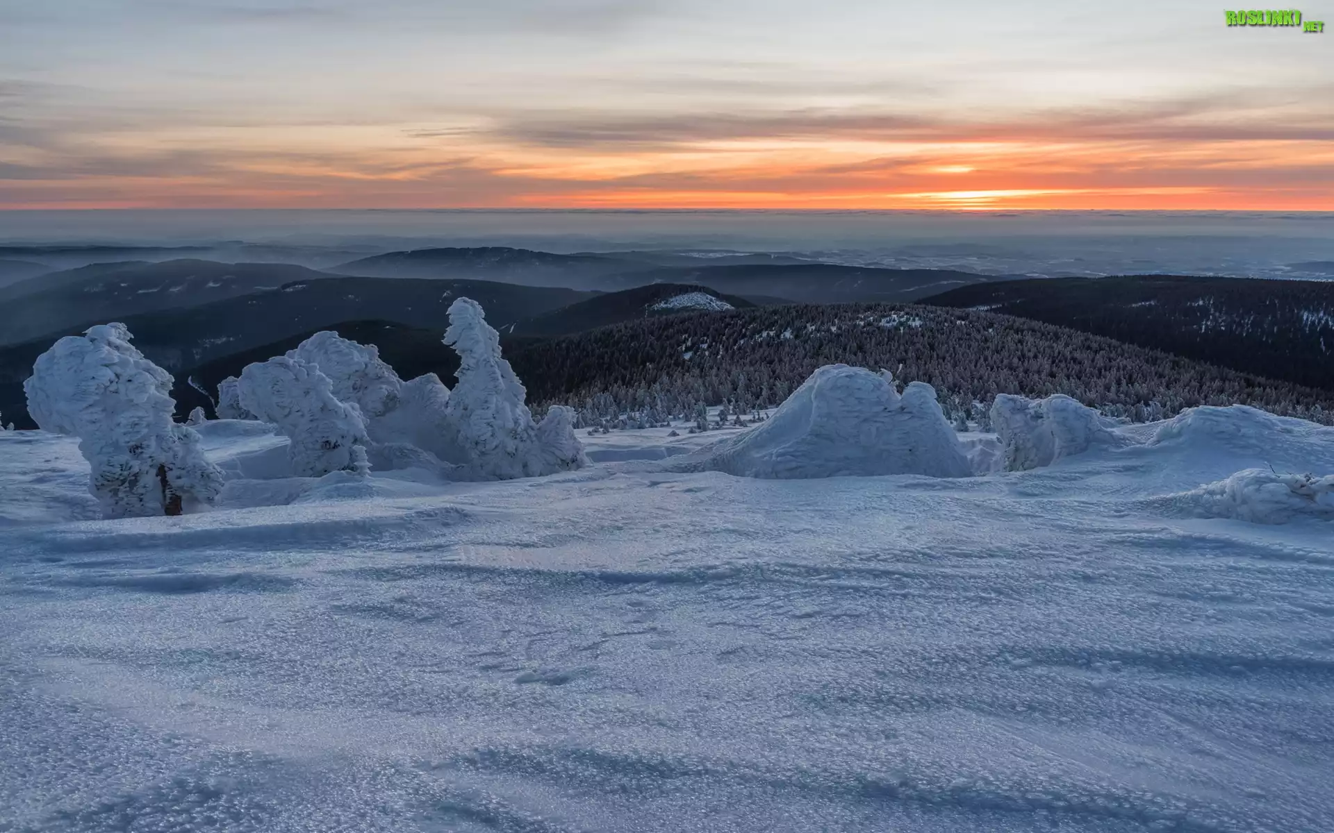 Rośliny: Zima, Wzgórza, Ośnieżone, Drzewa, Zachód słońca