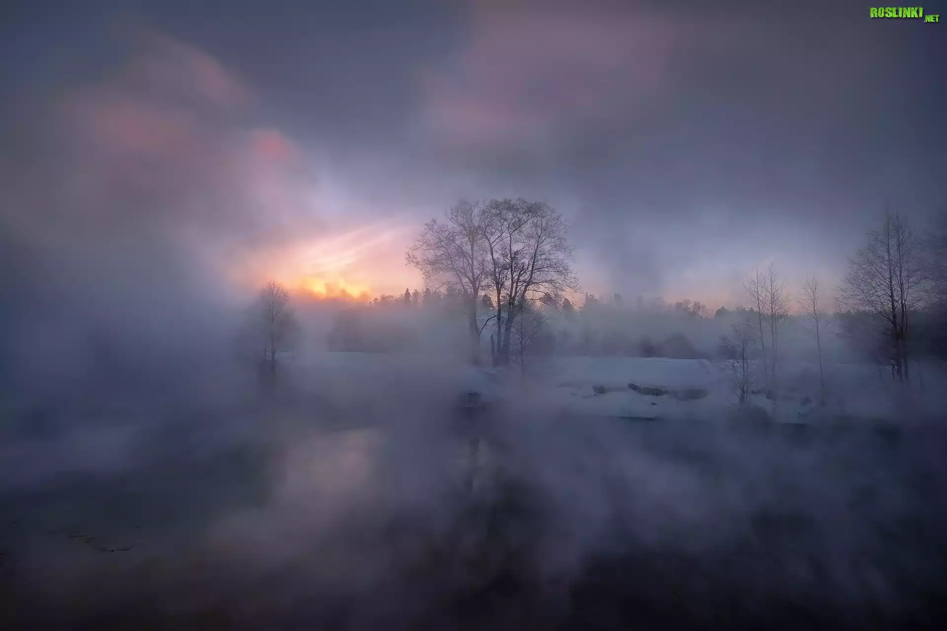 Rośliny: Zima, Mgła, Rzeka, Drzewa, Zachód słońca