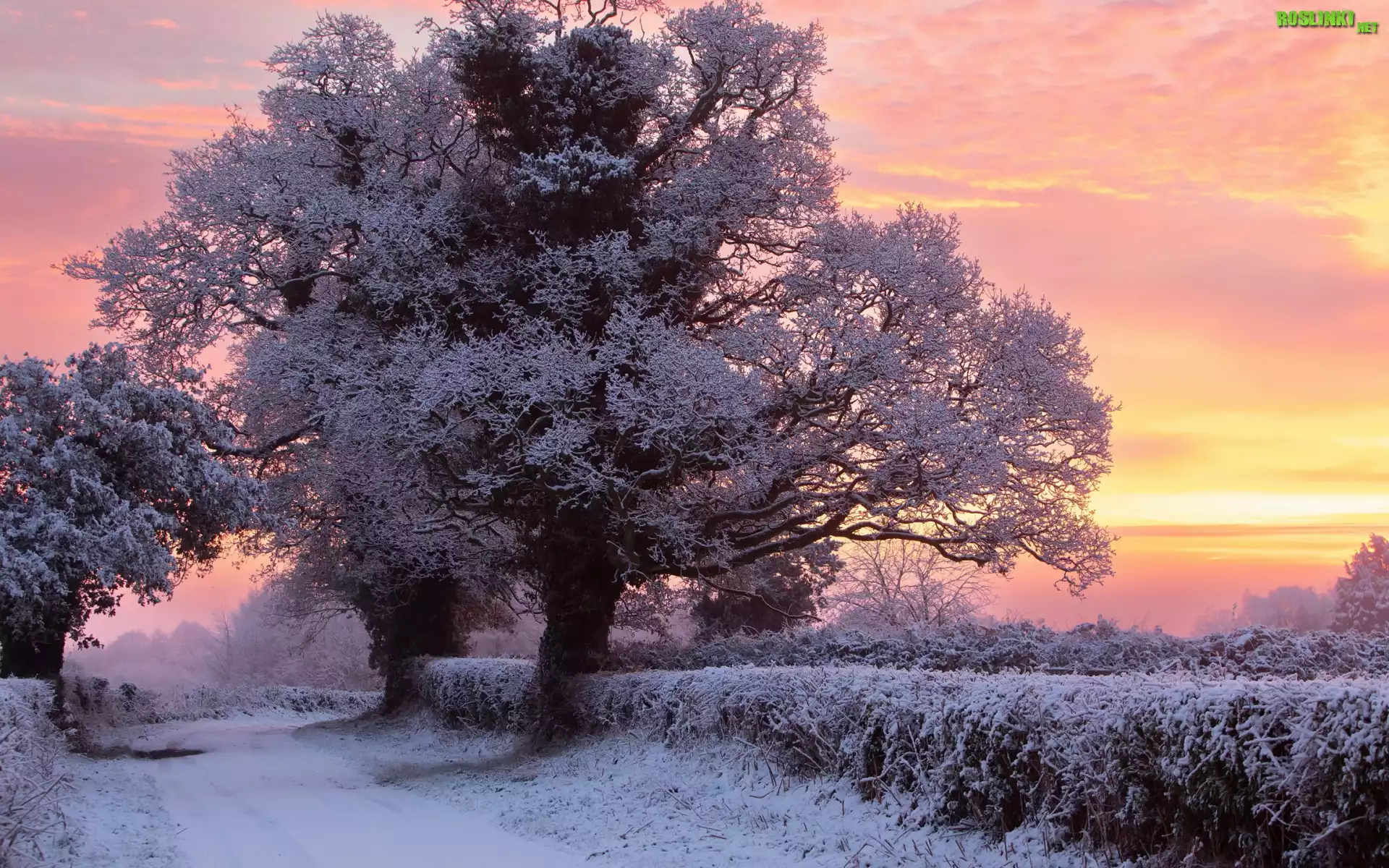 Rośliny: Zima, Droga, Oszronione, Drzewa, Krzewy, Śnieg, Zachód słońca, Mgła