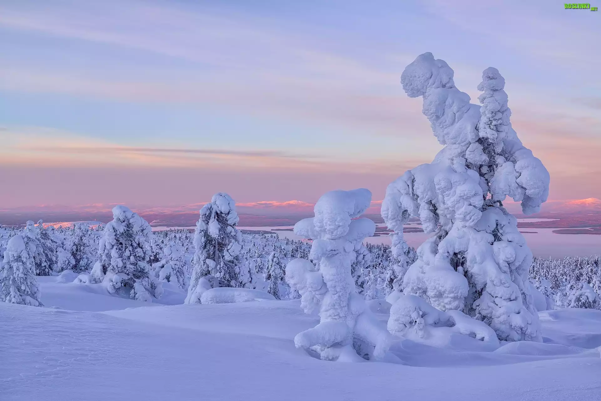 Rośliny: Zima, Drzewa, Śnieg, Zaróżowione, Niebo