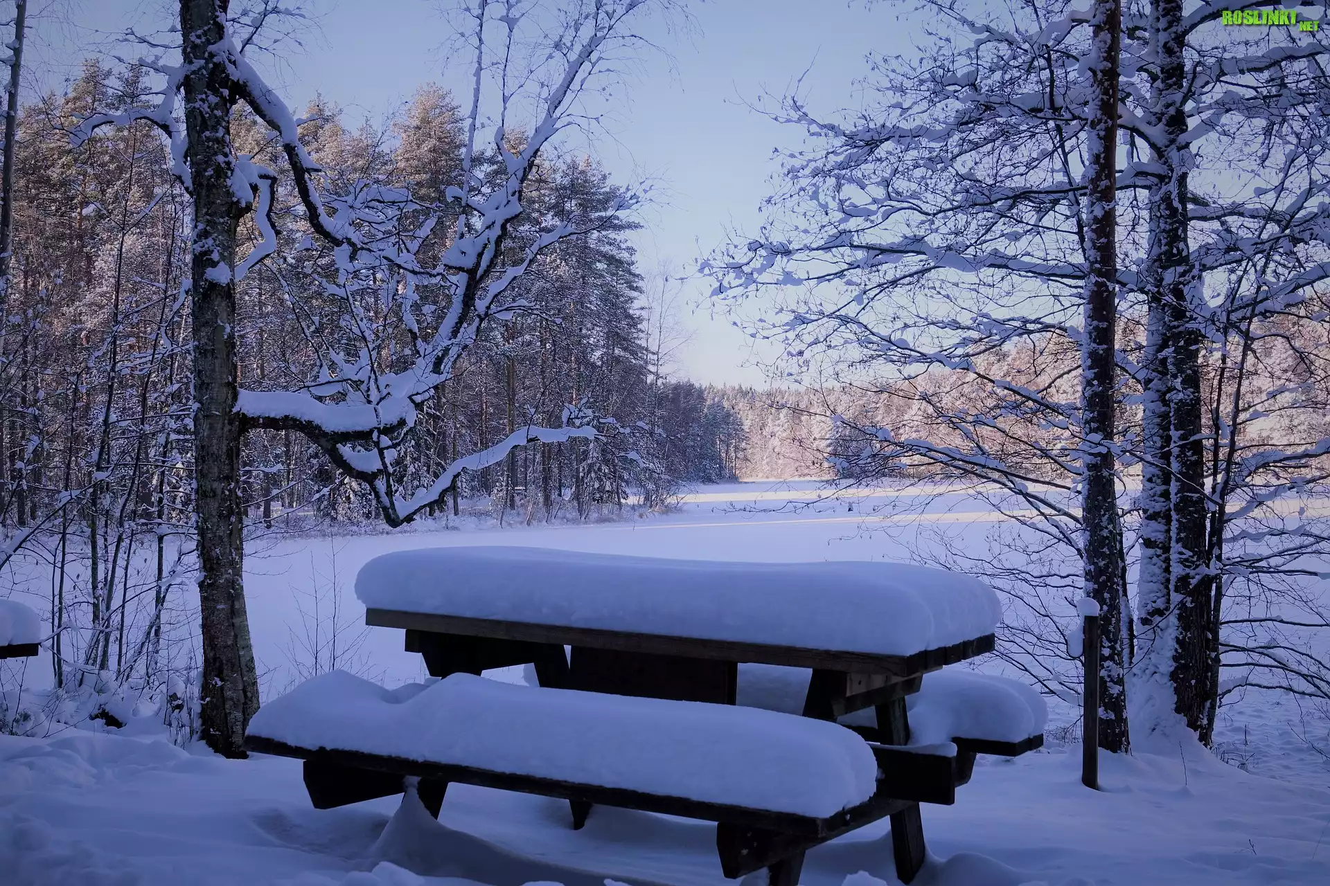 Rośliny: Zima, Ławka, Stół, Drzewa, Zaśnieżone, Jezioro