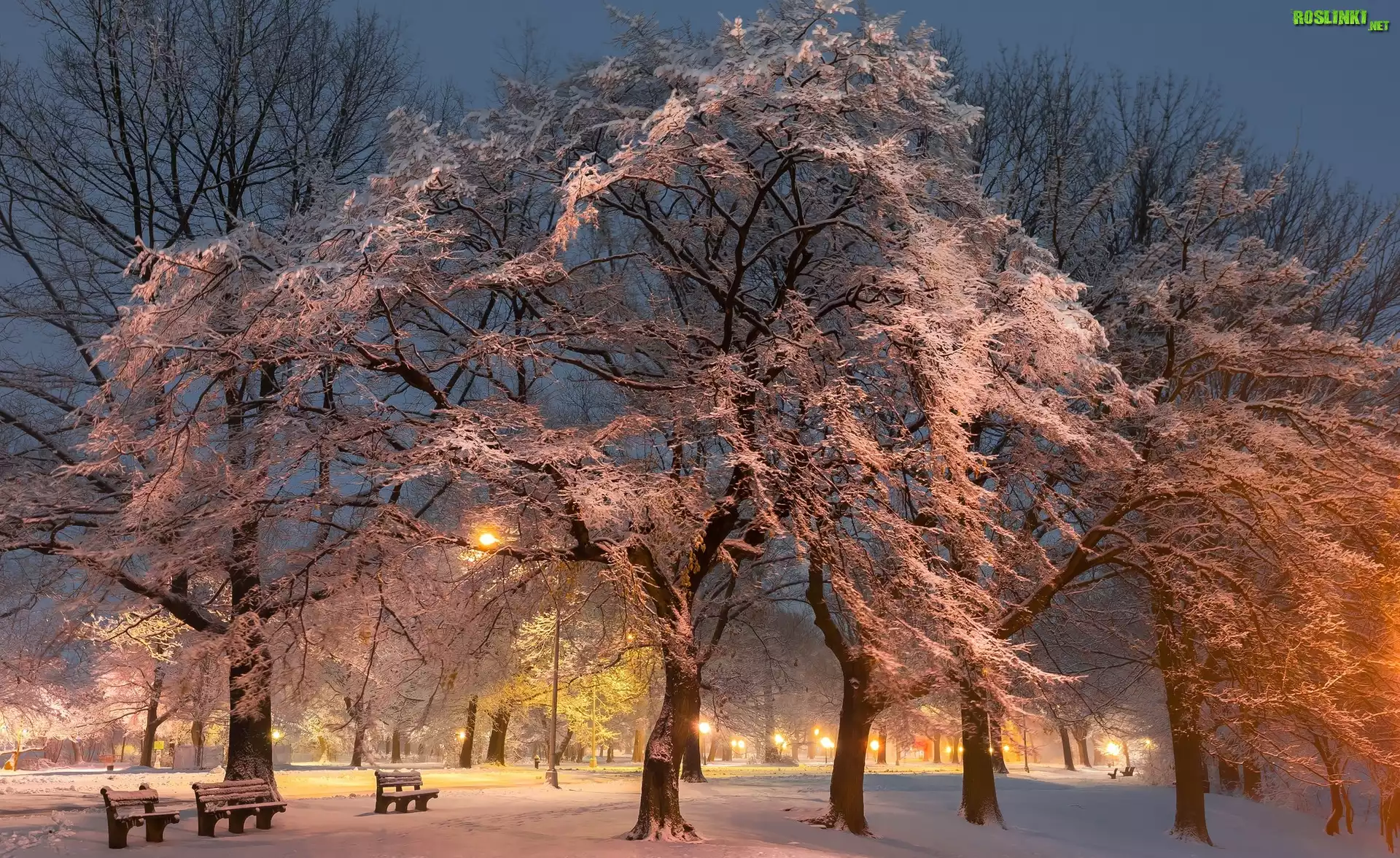 Rośliny: Zima, Park, Latarnie, Zmrok, Drzewa