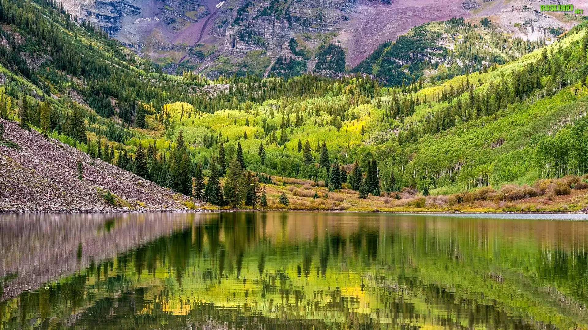 Rośliny: Jezioro Maroon Lake, Zbocza, Góry, Drzewa, Aspen, Kolorado, Stany Zjednoczone