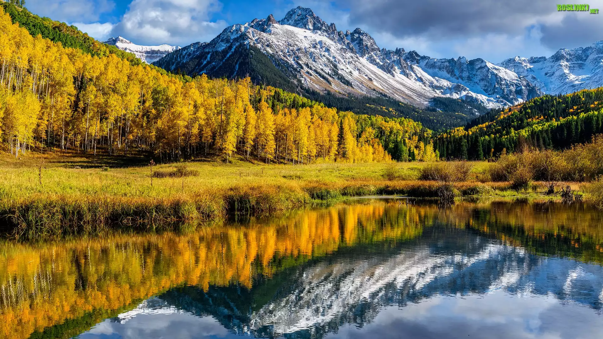 Góry, San Juan Mountains, Góra, Mount Sneffels, Jezioro, Blue Lake, Las, Drzewa, Jesień, Stan Kolorado, Stany Zjednoczone |