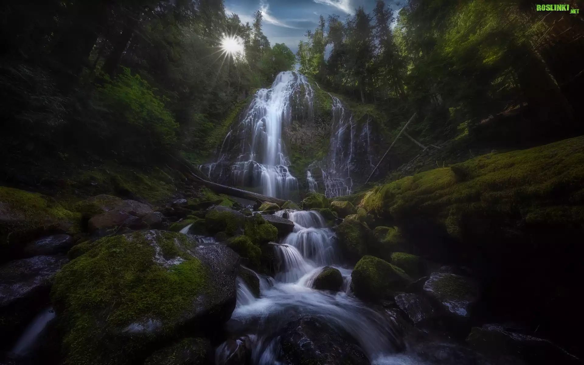 Stany Zjednoczone, Stan Oregon, Willamette National Forest, Pasmo górskie Cascade Range, Góra North Sister, Wodospad Proxy Falls, Omszałe, Kamienie, Skała, Drzewa, Promienie słońca |