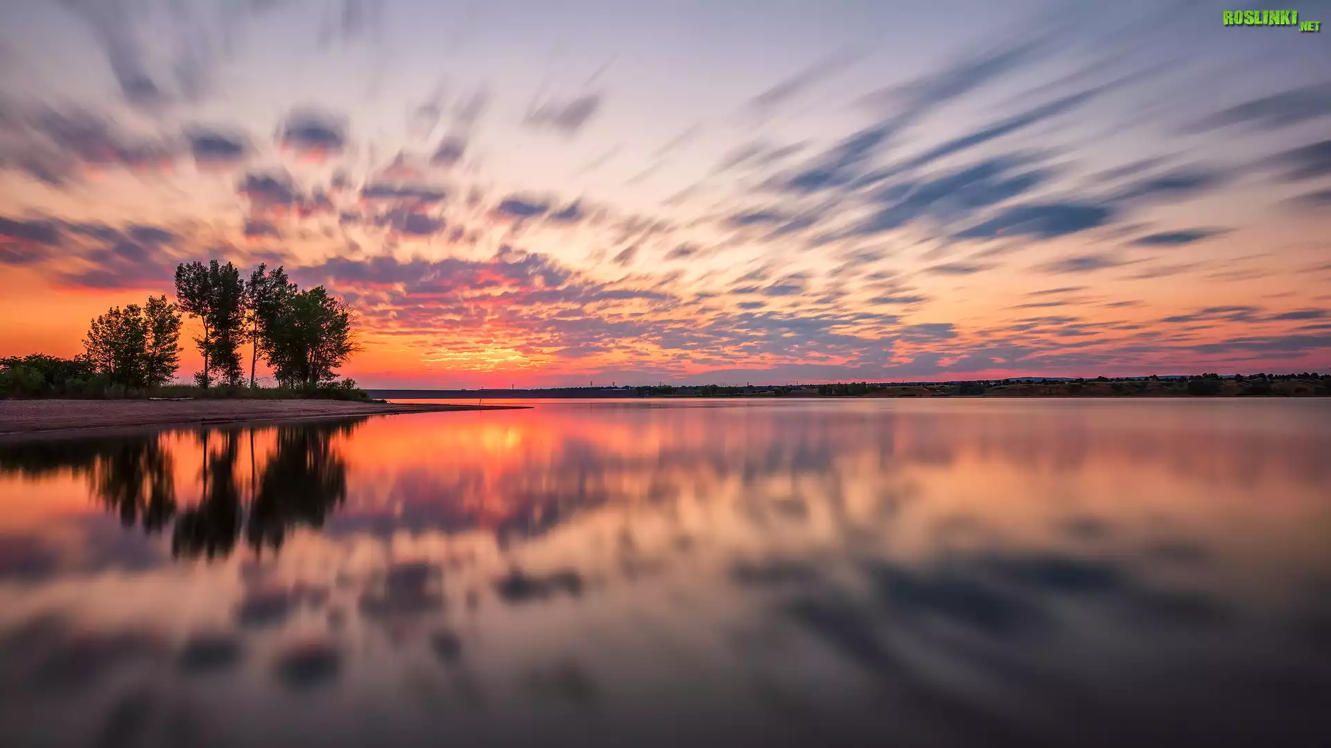 Rośliny: Wschód słońca, Chmury, Jezioro, Lake Chatfield, Drzewa, Kolorado, Stany Zjednoczone