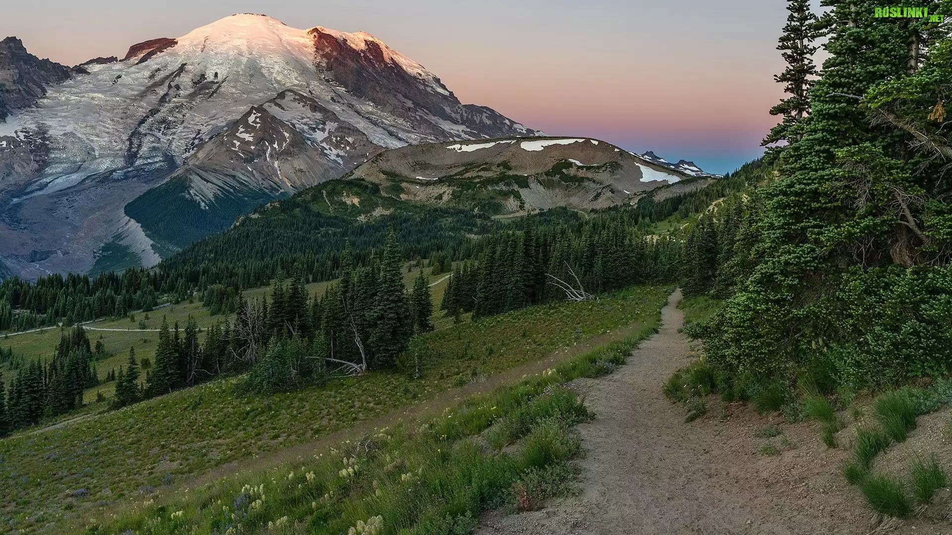 Wschód słońca, Góry, Śnieg, Droga, Drzewa, Stratowulkan, Mount Rainier, Park Narodowy Mount Rainier, Stan Waszyngton, Stany Zjednoczone |