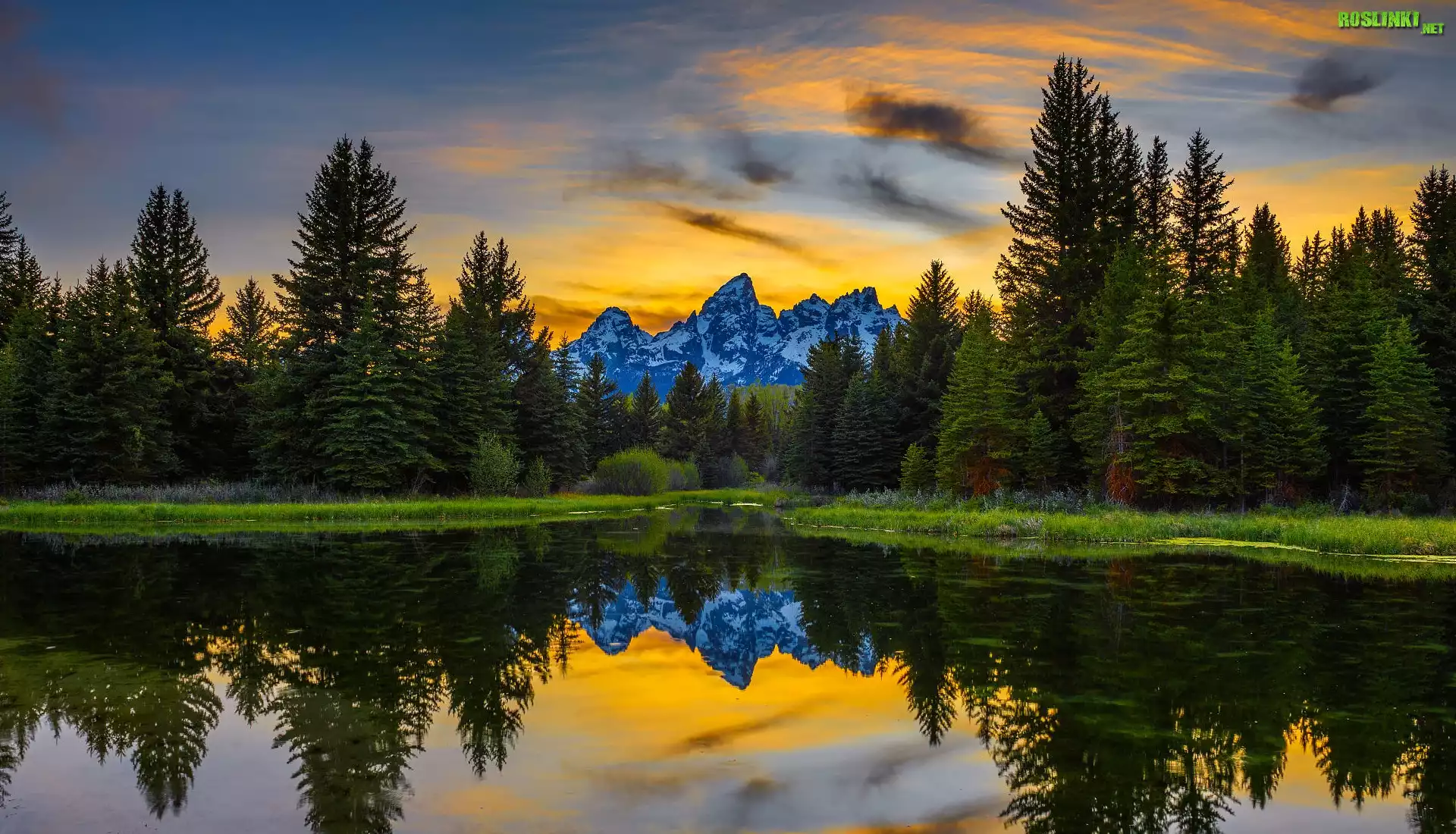 Drzewa, Góry, Teton Range, Rzeka, Snake River, Odbicie, Zachód słońca, Park Narodowy Grand Teton, Wyoming, Stany Zjednoczone |