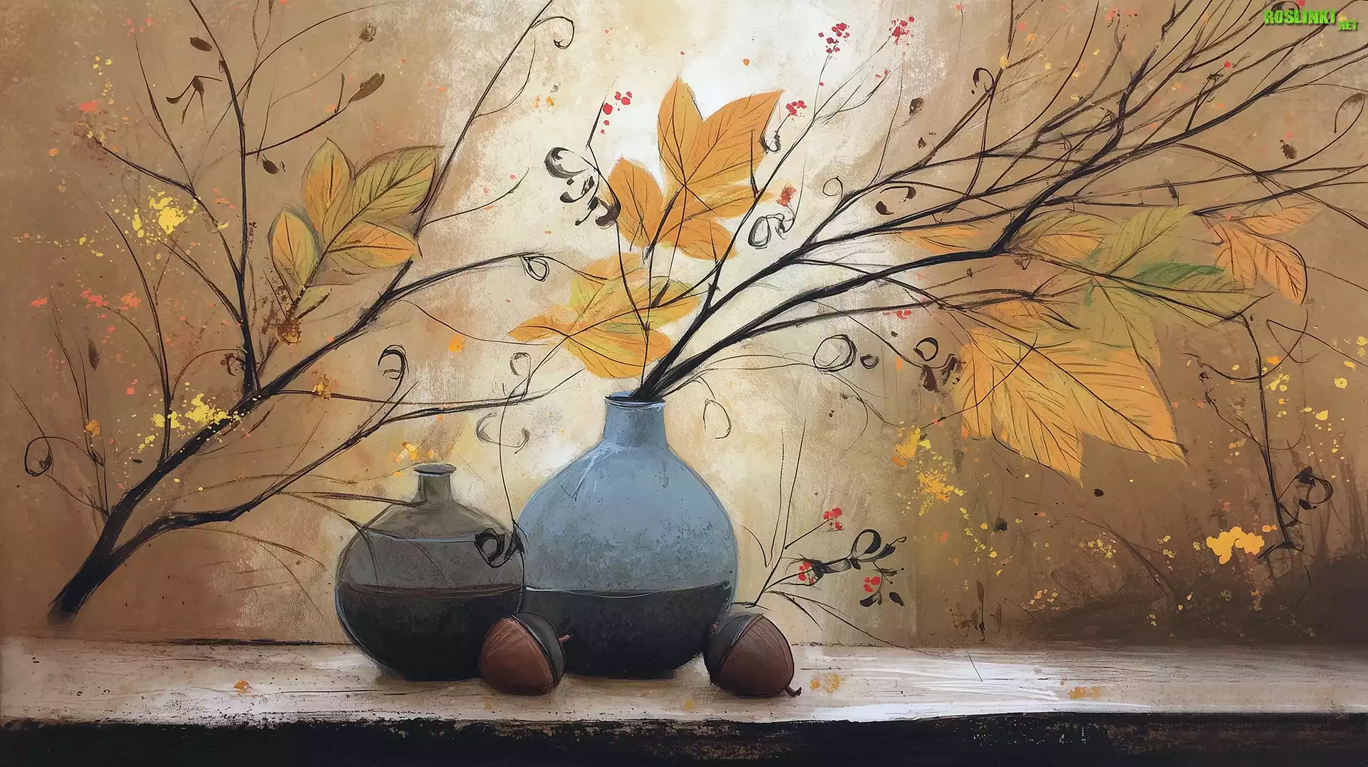 Wazony, Gałązki, Liście, Żołędzie, Grafika Ai