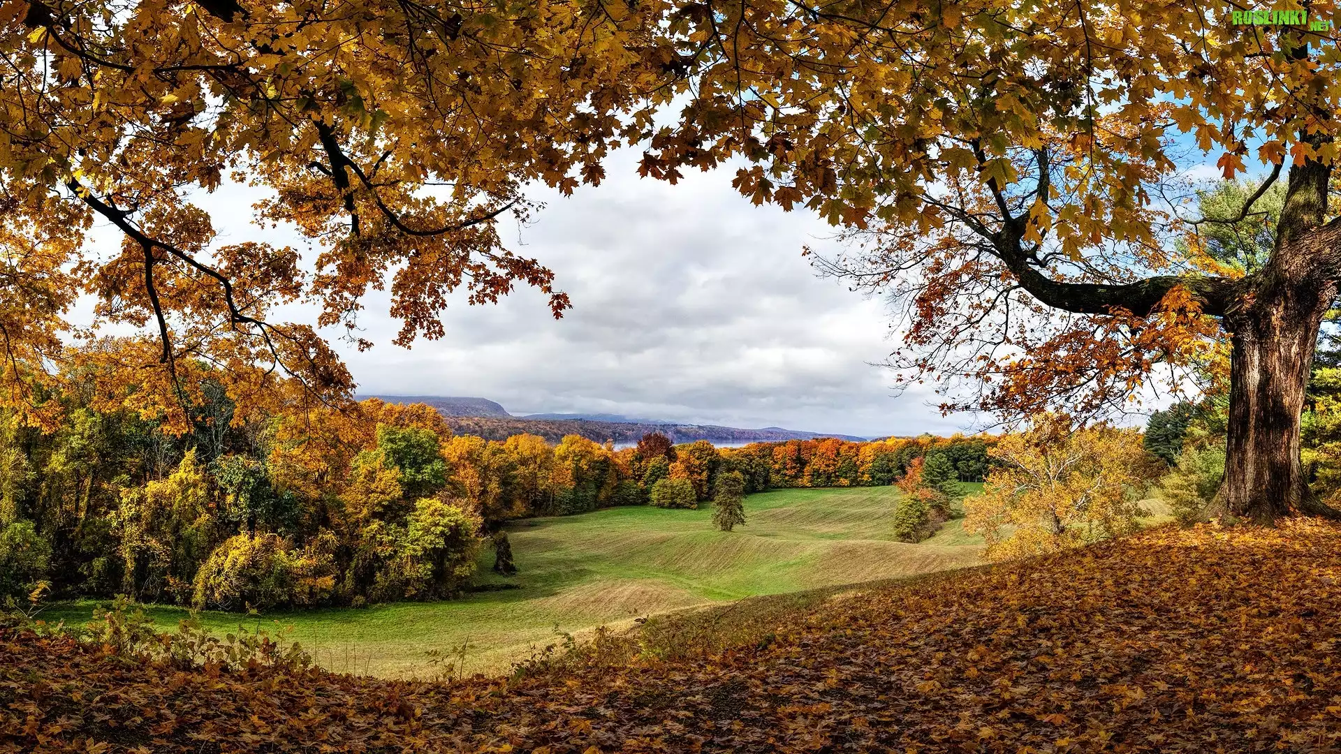 Jesień, Żółte, Drzewa, Liście, Łąka