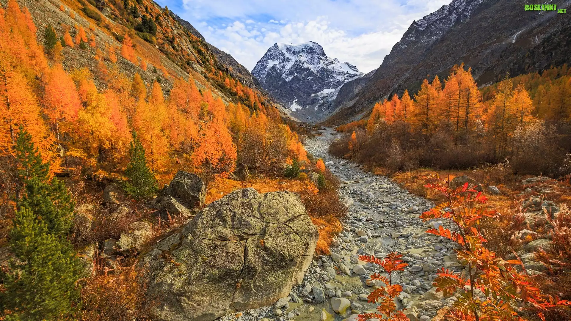 Rośliny: Jesień, Góry Pennińskie, Góra, Mont Collon, Żółte, Drzewa, Kamienie, Arolla, Szwajcaria